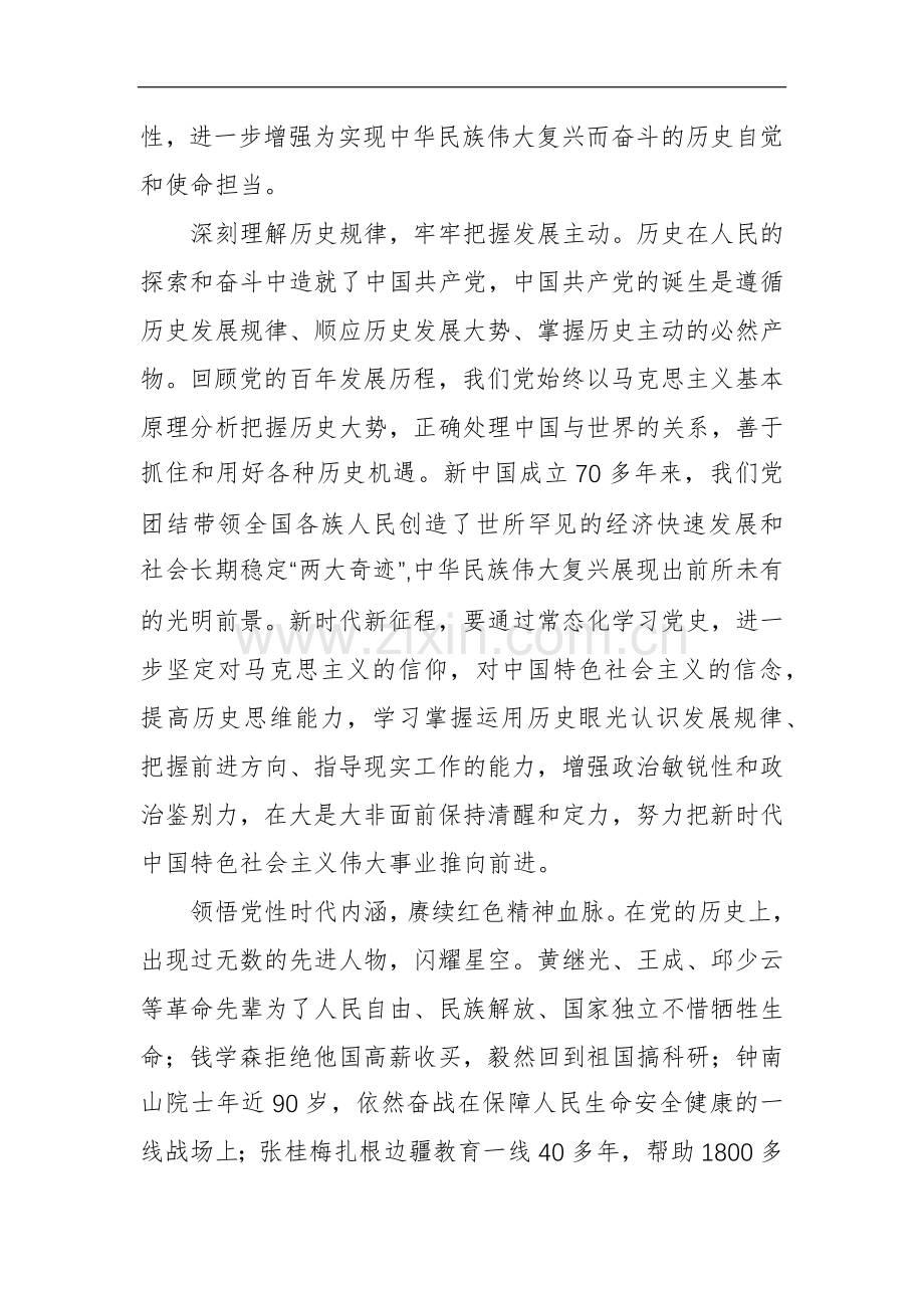 5、族伟大复兴展现出前所未有的光明前景。新时代新征程,要通过常态化学习党史,进一步坚定对马克思主义的信仰,对中国特色社会主义的信念,提高历史思维能力,学习掌握运用历史眼光认识发展规律、把握前进方向、指导现实工作的能力,增强政治敏锐性和政治鉴别力,在大是大非面前保持清醒和定力,努力把习近平新时代中国特色社会主义伟大事业推向前进。探寻人民至上密码,践行为民服务宗旨。“江山就是人民,人民就是江山。”纵观党的百年历史,我们党干革命、搞建设、抓改革,都是为人民谋利益,让人民过上好日子。从建党时几十名党员,到今天发展成为拥有 9800 多万名党员的执政党,充分彰显了“人心是最大的政治,人民是最大的底气”。习近平总书记在党的二十大报告中指出:“十年来,我们经历了对党和人民事业具有重大现实意义和深远历史意义的三件大事:一是迎来中国共产党成立一百周年,二是中国特色社会主义进入新时代,三是完成脱贫攻坚、全面建成小康社会的历史任务,实现第一个百年奋斗目标。”“三件大事”的历史性胜利证明,中国共产党始终同人民在一起,为人民利益而奋斗。新时代新征程,要通过常态化学习党史,深学细悟领会“人民至上”,自觉践行全心全意为人民服 4 务的根本宗旨,认真倾听群众呼声,及时关注群众心声,全力推动改革发展成果更多更公平惠及全体人民,不断增强人民群众的获得感、幸福感、安全感。