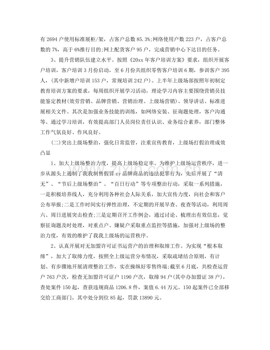 3、提升营销队伍建立水平。按照《20xx年客户培训方案》要求,组织开展客户培训,客户培训3月份启动,至6月份共组织零售客户培训6期,参训客户395人,(其中新增户培训153户,常规培训242户)。上半年上级场部按照年初制定教育培训方案的要求,每周组织开展学习活动,理论学习内容主要围绕营销员技能鉴定教材(效劳营销、品牌营销、营销治理、上级场营销)、领导讲话、标准进展相关文件。其次是加强业务技能的训练,如网络安装、征询题处理,客户沟通等。通过学习培训,有效提高部门人员岗位责任认识、业务综合素养,部门整体工作气氛良好、作风良好。