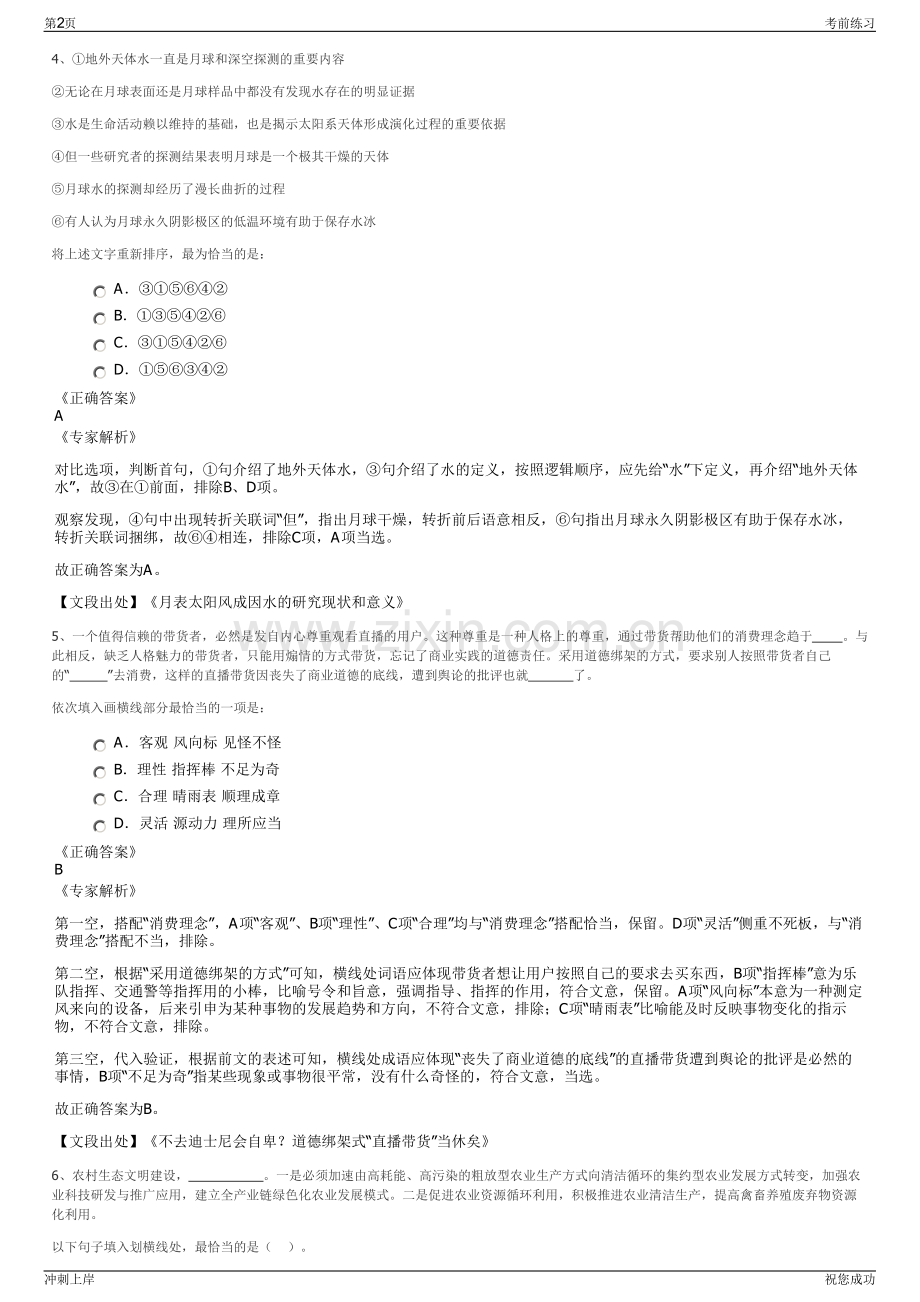2024年湖北武汉农业集团招聘笔试冲刺题(带答案解析)【下载须知】:1,本套练习包含以下题型:言语理解与表达题、常识判断题、数量关系题、判断推理题和资料分析题等题型;共135道。2、本套试题根据常见招考题总结归纳,主要用于练习答题思路和拓展知识面。3、本套试题非考试真题,且与湖北武汉农业集团无关。一、第一部分言语理解与表达(本部分包括表达与理解两方面的内容。请根据题目要求,在四个选项中选出一个最恰当的答案。)1、大秦帝国、汉武大帝、雍正王朝一部部歌颂盛世之治的文艺作品引来无数目光,然而,那些极尽繁华的书写却难掩历史叙事的思想缺失。从政治文化视野看,“盛世情结”叙事往往过分认同人治文化与功利立场。这段文字意在说明()。A 历史叙事作品缺乏思想 B“盛世情结”作品的价值局限 C 文艺作品应该抛开功利立场 D 歌颂盛世的作品需重新审视正确答案B专家解析文段首先指出大秦帝国、汉武大帝、雍正王朝等歌颂盛世之治文艺作品的繁盛;接着转折指出此类叙事作品在思想方面、政治文化方面均存在缺陷,意在强调具有“盛世情结”的作品仍然具有价值局限。因此B项正确。2、如果从伦理的角度着眼,两极分化是一种悲剧性的社会现实。面对落入破产者行列的许多小生产者和劳动者,我们不能不寄予深切的同情。但是从生产力的角度着眼,两极分化是商品经济的价值规律发生作用后的必然结果,它发挥着约束和激励的功能,使人力资源和物质资源都趋于更合理的配置。对这段话理解正确的一项是()。A 从发展商品经济的角度看,两极分化具有一定的意义 B 我们应对落入破产者行列的小生产者和劳动者寄予深切的同情 C 我们不应该对落入破产者行列的小生产者和劳动者寄予太多的同情 D 我们应该首先从经济的角度考虑问题,而不应该过多的从伦理的角度考虑问题正确答案A专家解析文段先讲两极分化的悲剧性社会现实,再以“但是”转折,重点阐述从生产力角度看,两极分化具有一定意义,因此A项正确。3、判断下列句子使用的修辞手法,正确的一项是()。(1)我到了自家的房外,我的母亲早已迎着出来了,接着便飞出了八岁的侄儿宏儿。(2)在这里,蓝天明月,秃顶的山,单调的黄土,浅濑的水,似乎都是最恰当不过的背景,无可更换。(3)微风过处,送来缕缕清香,仿佛远处高楼上渺茫的歌声似的。(4)宝剑锋从磨砺出,梅花香自苦寒来。A 比拟比喻比喻对偶 B 夸张排比通感对仗 C 比拟排比通感对偶 D 夸张比喻比喻对仗正确答案C专家解析(1)句,由“飞出了”可知,此句采用了拟物的手法。(2)句,“秃顶的山,单调的黄土,浅濑的水”采用了排比的手法。(3)句,把无声的嗅觉变为美妙的听觉,令人神往,为通感的手法。(4)句,为对偶。因此C项正确。第1页考前练习冲刺上岸祝您成功4、地外天体水一直是月球和深空探测的重要内容无论在月球表面还是月球样品中都没有发现水存在的明显证据水是生命活动赖以维持的基础,也是揭示太阳系天体形成演化过程的重要依据但一些研究者的探测结果表明月球是一个极其干燥的天体月球水的探测却经历了漫长曲折的过程有人认为月球永久阴影极区的低温环境有助于保存水冰将上述文字重新排序,最为恰当的是:A B C D正确答案A专家解析对比选项,判断首句,句介绍了地外天体水,句介绍了水的定义,按照逻辑顺序,应先给“水”下定义,再介绍“地外天体水”,故在前面,排除B、D项。观察发现,句中出现转折关联词“但”,指出月球干燥,转折前后语意相反,句指出月球永久阴影极区有助于保存水冰,转折关联词捆绑,故相连,排除C项,A项当选。故正确答案为A。【文段出处】月表太阳风成因水的研究现状和意义5、一个值得信赖的带货者,必然是发自内心尊重观看直播的用户。这种尊重是一种人格上的尊重,通过带货帮助他们的消费理念趋于 。与此相反,缺乏人格魅力的带货者,只能用煽情的方式带货,忘记了商业实践的道德责任。采用道德绑架的方式,要求别人按照带货者自己的“”去消费,这样的直播带货因丧失了商业道德的底线,遭到舆论的批评也就 了。依次填入画横线部分最恰当的一项是:A客观 风向标 见怪不怪 B理性 指挥棒 不足为奇 C合理 晴雨表 顺理成章 D灵活 源动力 理所应当正确答案B专家解析第一空,搭配“消费理念”,A项“客观”、B项“理性”、C项“合理”均与“消费理念”搭配恰当,保留。D项“灵活”侧重不死板,与“消费理念”搭配不当,排除。第二空,根据“采用道德绑架的方式”可知,横线处词语应体现带货者想让用户按照自己的要求去买东西,B项“指挥棒”意为乐队指挥、交通警等指挥用的小棒,比喻号令和旨意,强调指导、指挥的作用,符合文意,保留。A项“风向标”本意为一种测定风来向的设备,后来引申为某种事物的发展趋势和方向,不符合文意,排除;C项“晴雨表”比喻能及时反映事物变化的指示物,不符合文意,排除。第三空,代入验证,根据前文的表述可知,横线处成语应体现“丧失了商业道德的底线”的直播带货遭到舆论的批评是必然的事情,B项“不足为奇”指某些现象或事物很平常,没有什么奇怪的,符合文意,当选。故正确答案为B。【文段出处】不去迪士尼会自卑?道德绑架式“直播带货”当休矣6、农村生态文明建设,。一是必须加速由高耗能、高污染的粗放型农业生产
