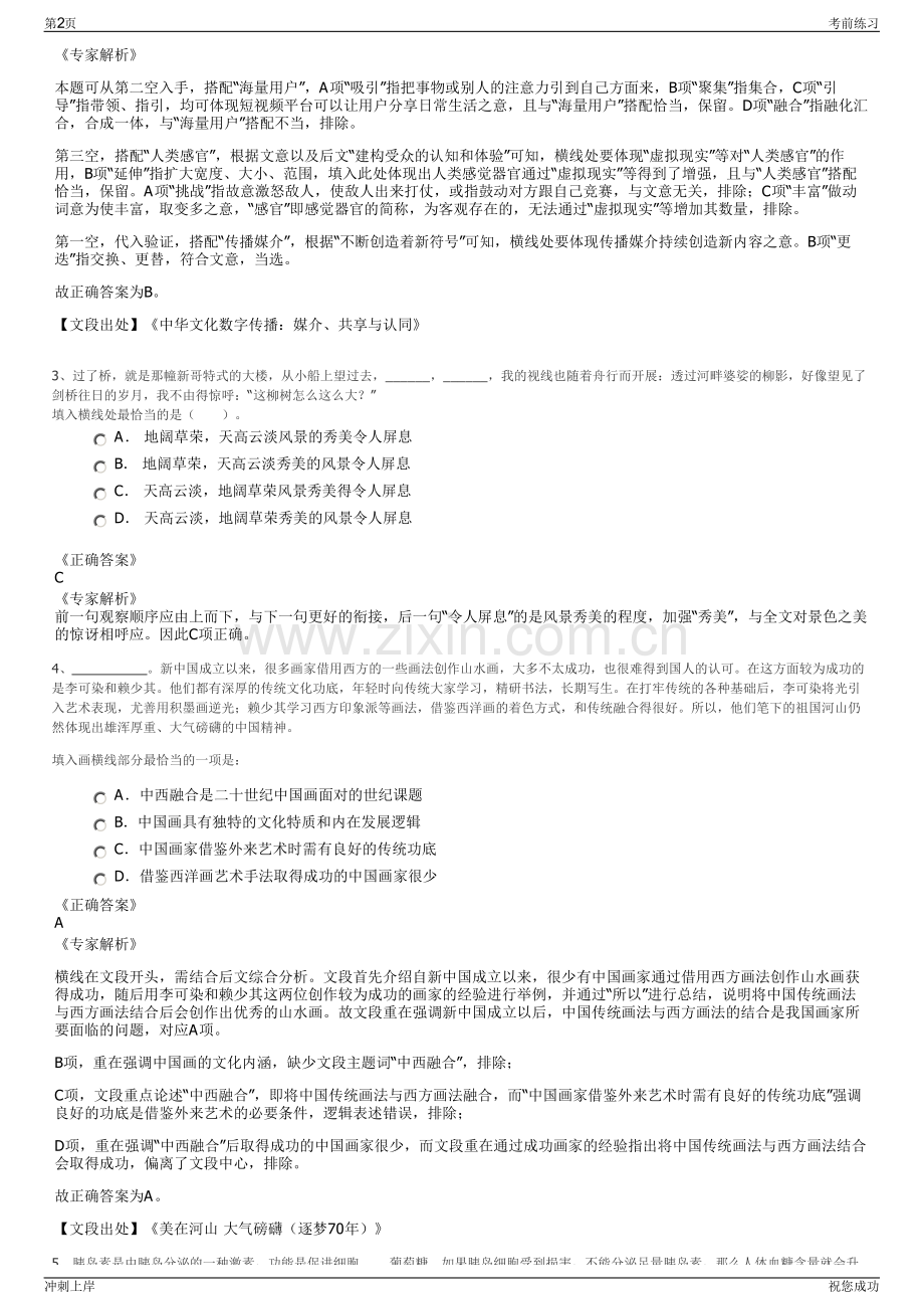 2024年珠海华发集团招聘笔试冲刺题(带答案解析)【下载须知】:1,本套练习包含以下题型:言语理解与表达题、常识判断题、数量关系题、判断推理题和资料分析题等题型;共135道。2、本套试题根据常见招考题总结归纳,主要用于练习答题思路和拓展知识面。3、本套试题非考试真题,且与珠海华发集团无关。一、第一部分言语理解与表达(本部分包括表达与理解两方面的内容。请根据题目要求,在四个选项中选出一个最恰当的答案。)1、近年来,在科技的加持下,从3D扫描、3D打印再到AR沉浸式体验,“沉睡”千年的历史文物不断被“唤醒”,走入大众视野。“考古盲盒”的走红、唐宫夜宴的惊艳和“博物院元宵奇妙夜”的新奇,都离不开技术的支撑。虚拟现实、增强现实等数字“黑科技”,为沉浸式展览和体验提供了发展空间,让古今对话成为可能,也让时空的穿透力变得真实可感。同时,短视频和社交平台等传播领域的新技术,也让文化产品能够以更快的速度、更强的力度在新媒体平台迅速传播并维持热度。最适合做这段文字标题的是:A科技赋能让文物重新“活起来”B“黑科技”成就文物的古今对话 C沉浸式体验让文物再度“热起来”D把握新技术,加速文物的大众传播正确答案A专家解析本题为标题填入题。文段开篇提出观点,指出科技唤醒了历史文物,并通过“考古盲盒”、唐宫夜宴等举例论证,接着说明虚拟现实等数字“黑科技”让古今对话成为可能,并通过“同时”表示并列,列举短视频等传播领域的新技术让文化产品传播速度更快、力度更强,属于对前文观点的进一步解释说明,故文段为总分结构,意在说明科技唤醒了历史文物,对应A项。B项“黑科技”、D项“新技术”均对应文段解释说明部分,非重点,且表述片面,排除;C项,“沉浸式体验”是科技带来的体验效果,并非技术本身,偷换概念,排除。故正确答案为A。【文段出处】中国文物报代表委员专访|马萧林委员:和“考古盲盒”文物大众传播的有益探索2、当下,传播媒介的 为文化传播不断创造着新符号。其中,短视频平台跨越专业内容生产门槛,海量用户,进行日常生活的自我呈现,体现了传播的视觉转向和影像化特点。而虚拟现实、增强现实、混合现实则在视觉、听觉、触觉等多模态符号中 了人类感官,建构受众的认知和体验。依次填入画横线部分最恰当的一项是:A创新 吸引 挑战 B更迭 聚集 延伸 C涌现 引导 丰富 D升级 融合 重塑正确答案B第1页考前练习冲刺上岸祝您成功专家解析本题可从第二空入手,搭配“海量用户”,A项“吸引”指把事物或别人的注意力引到自己方面来,B项“聚集”指集合,C项“引导”指带领、指引,均可体现短视频平台可以让用户分享日常生活之意,且与“海量用户”搭配恰当,保留。D项“融合”指融化汇合,合成一体,与“海量用户”搭配不当,排除。第三空,搭配“人类感官”,根据文意以及后文“建构受众的认知和体验”可知,横线处要体现“虚拟现实”等对“人类感官”的作用,B项“延伸”指扩大宽度、大小、范围,填入此处体现出人类感觉器官通过“虚拟现实”等得到了增强,且与“人类感官”搭配恰当,保留。A项“挑战”指故意激怒敌人,使敌人出来打仗,或指鼓动对方跟自己竞赛,与文意无关,排除;C项“丰富”做动词意为使丰富,取变多之意,“感官”即感觉器官的简称,为客观存在的,无法通过“虚拟现实”等增加其数量,排除。第一空,代入验证,搭配“传播媒介”,根据“不断创造着新符号”可知,横线处要体现传播媒介持续创造新内容之意。B项“更迭”指交换、更替,符合文意,当选。故正确答案为B。【文段出处】中华文化数字传播:媒介、共享与认同3、过了桥,就是那幢新哥特式的大楼,从小船上望过去,_,_,我的视线也随着舟行而开展:透过河畔婆娑的柳影,好像望见了剑桥往日的岁月,我不由得惊呼:“这柳树怎么这么大?”填入横线处最恰当的是()。A 地阔草荣,天高云淡风景的秀美令人屏息 B 地阔草荣,天高云淡秀美的风景令人屏息 C 天高云淡,地阔草荣风景秀美得令人屏息 D 天高云淡,地阔草荣秀美的风景令人屏息正确答案C专家解析前一句观察顺序应由上而下,与下一句更好的衔接,后一句“令人屏息”的是风景秀美的程度,加强“秀美”,与全文对景色之美的惊讶相呼应。因此C项正确。4、。新中国成立以来,很多画家借用西方的一些画法创作山水画,大多不太成功,也很难得到国人的认可。在这方面较为成功的是李可染和赖少其。他们都有深厚的传统文化功底,年轻时向传统大家学习,精研书法,长期写生。在打牢传统的各种基础后,李可染将光引入艺术表现,尤善用积墨画逆光;赖少其学习西方印象派等画法,借鉴西洋画的着色方式,和传统融合得很好。所以,他们笔下的祖国河山仍然体现出雄浑厚重、大气磅礴的中国精神。填入画横线部分最恰当的一项是:A中西融合是二十世纪中国画面对的世纪课题 B中国画具有独特的文化特质和内在发展逻辑 C中国画家借鉴外来艺术时需有良好的传统功底 D借鉴西洋画艺术手法取得成功的中国画家很少正确答案A专家解析横线在文段开头,需结合后文综合分析。文段首先介绍自新中国成立以来,很少有中国画家通过借用西方画法创作山水画获得成功,随后用李可染和赖少其这两位创作较为成功的画家的经验进行举例,并通过“所