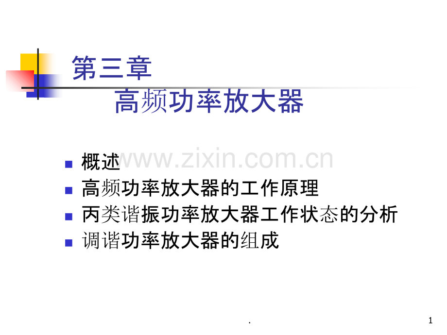 第三章 高频功率放大器n概述n高频功率放大器的工作原理n丙类谐振功率放大器工作状态的分析n调谐功率放大器的组成1.3.1 概述概述2.3.3.2高频功率放大器的工作原理3.2.1高频调谐功率放大器特点4.5.从从电压电压、电电流波形上看,丙流波形上看,丙类类工作工作状状态为态为什么效率高?什么效率高?6.3.2.2 工作原理7.8.9.10.11.12.3.2.3 输出功率和效率的计算13.14.15.16.17.18.3.3丙类谐振功率放大器工作状态的分析3.3.1晶体管的集电极动态特性1.动态动态特性特性2.晶体管晶体管输输出特性的折出特性的折线线化化19.3.动态动态特性的作法特性的作法(1)写出写出 和和 表达式表达式20.(2)作出作出动态动态特性特性21.(3)画出波形画出波形22.(4)根据根据图进图进行行讨论讨论23.24.3.3.2 高频功率放大器的负载特性(1)负载负载特性特性(2)对对 ic 波形的影响波形的影响25.26.(3)讨论讨论27.28.29.30.31.32.33.34.3.3.3 各级电压对工作状态的影响35.过压过压临临界界欠欠压压36.过压过压临临界界欠欠压压37.3.4 谐调功率放大器的电路组成3.4.1谐调功率放大器的馈电线路38.39.40.41.42.43.44.45.46.47.3.4 丁类功率放大器简介48.