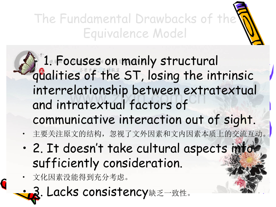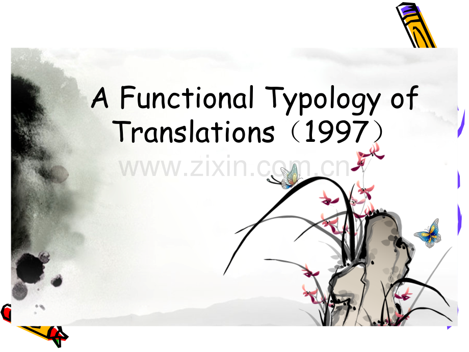 A Functional Typology of Translations(1997)The Fundamental Drawbacks of the Equivalence Model 1.Focuses on mainly structural qualities of the ST,losing the intrinsic interrelationship between extratextual and intratextual factors of communicative interaction out of sight.主要关注原文的结构,忽视了文外因素和文内因素本质上的交流互动。2.It doesnt take cultural aspects into sufficiently consideration.文化因素没能得到充分考虑。3.Lacks consistency缺乏一致性。4.The transfer standards are different or even contradictory.翻译标准不一致,甚至相互矛盾5.It doesnt account for culture-specific differences in translational concepts.没有解释出文化类型的不同点 6.Excludes target-language text which do not satisfy the criterion of equivalence.对等模式将那些不满足对等标准的目的语文本排除在外 7.The source text and its value are considered to be the one and only standard.把源语文本和其价值视为唯一的标准 Functionalism Plus Loyalty as an Alternative ModelSince obviously the equivalence model is not adequate to the needs of professional translation in a modern society,here are what we need for an alternative:既然对等理论不足以满足现代社会职业翻译的需要,以下是几种替代模式:1.a pragmatic model语用模式2.a cultural-oriented model文化导向模式3.a consistent model一致模式4.a comprehensive model综合模式5.an anti-universalist model反普遍主义模式6.a practical model实践模式7.an expert model专家模式The Skopos Model目的论One of the main factors in the skopos of a communicative activity is the receiver or addressee with the their specific communicative needs.目的论的主要因素是带着不同交际需求的接受者或听话人 This applies both to ST and TT.对源语文本和译语文本都适用The focus is shifted from ST to TT and its communicative function or functions.关注点从源语转移到译语和译语的功能Characteristics This model is pragmatic in that it takes target-orientation seriously and even makes the target receiver the most important determinant of translational decisions.这个理论是务实的,因为它认真对待译文读者,并且将其作为决定译文好坏的最重要决定者。This model is consistent because it permits any translation procedures which will lead to a functional TT.这个理论是一致的,因为它容许任何功能性的翻译。This model is comprehensive because target function is considered to be the main standard for any translation process.这个理论可以理解,因为它把目的功能作为主要的翻译准则。This model is practical because it can be applied to any assignment occurring in professional translation practice.这个理论是实用的,因为它可以应用于任何职业翻译任务。This model gives due consideration to the role of the translator as an expert.这个理论给了译者应有的专家地位。Functionality Plus LoyaltyTwo Reservations to the Skopos Model by Nord.诺德对于目的论有两个保留意见:a.culture-specificity of translational model翻译模式的文化特殊性b.relationship between the translator and the ST author.译者和原文作者的关系问题。for a,translator should meditate between the two cultures译者应该作为两种文化的中介for b,author and translator are equivalent作者和译者地位等同,译者应忠实于作者The Notion of Function功能的概念A Model of Basic Text Functions文本的几种功能 1.referential function指示功能 2.expressive function表情功能 3.appellative function呼唤功能 4.phatic function寒暄功能A Functional Typology of Translationsdocumentary translationWord-for-word translation逐字对译Literal translation字面翻译philological translation注释翻译exoticizing translation异域翻译instrumental translationEquifunctional translation等功能翻译Heterofunctional translation异功能翻译Homologous translation类体裁翻译The Limits of TranslationCopying or merely transliterating a text or text part cannot be called translating;nor can wen accept as a translation any rendering which does not respect the principle of loyalty.Example 12 CubaPlanning the Translation ProcessTranslation briefv(1)the senders intentionsv(2)the addresseev(3)the prospective time and place of text receptionv(4)the medium over which the text will be transmittedv(5)the motive for text production or receptionSource-text Analysis and Translation Strategyextratextual factor文外因素intratextual factor 文内因素n文外因素涉及信息发送者及其意图、接受者、媒介/渠道、交际地点、交际时间、交际动机、文本功能、互文因素等;n文内因素包含了从词、句、段落到内容主题等方面。Categorizing Translation Problems(a)pragmatic translation problem(b)intercultural translation problem(c)interlingual translation problem(d)text-specific translation problemA Functional Herarchy of Translation Problemslbottom-topustage1-structuresustage2-conventionsustage3-pragmatics(drawbacks)ltop-bottom