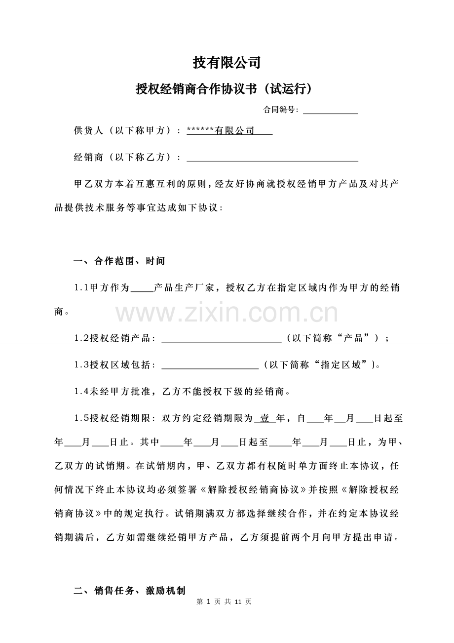 1.5授权经销期限:双方约定经销期限为 壹 年,自 年 月 日起至 年 月 日止。其中 年 月 日起至 年 月 日止,为甲、乙双方的试销期。在试销期内,甲、乙双方都有权随时单方面终止本协议,任何情况下终止本协议均必须签署《解除授权经销商协议》并按照《解除授权经销商协议》中的规定执行。试销期满双方都选择继续合作,并在约定本协议经销期满后,乙方如需继续经销甲方产品,乙方须提前两个月向甲方提出申请。