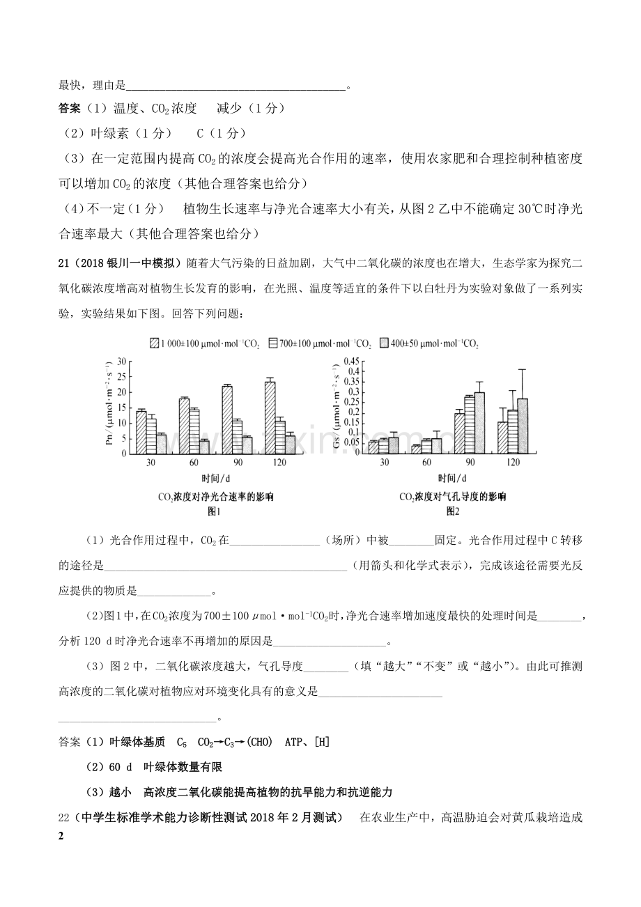 21(2018银川一中模拟)随着大气污染的日益加剧,大气中二氧化碳的浓度也在增大,生态学家为探究二氧化碳浓度增高对植物生长发育的影响,在光照、温度等适宜的条件下以白牡丹为实验对象做了一系列实验,实验结果如下图。回答下列问题: