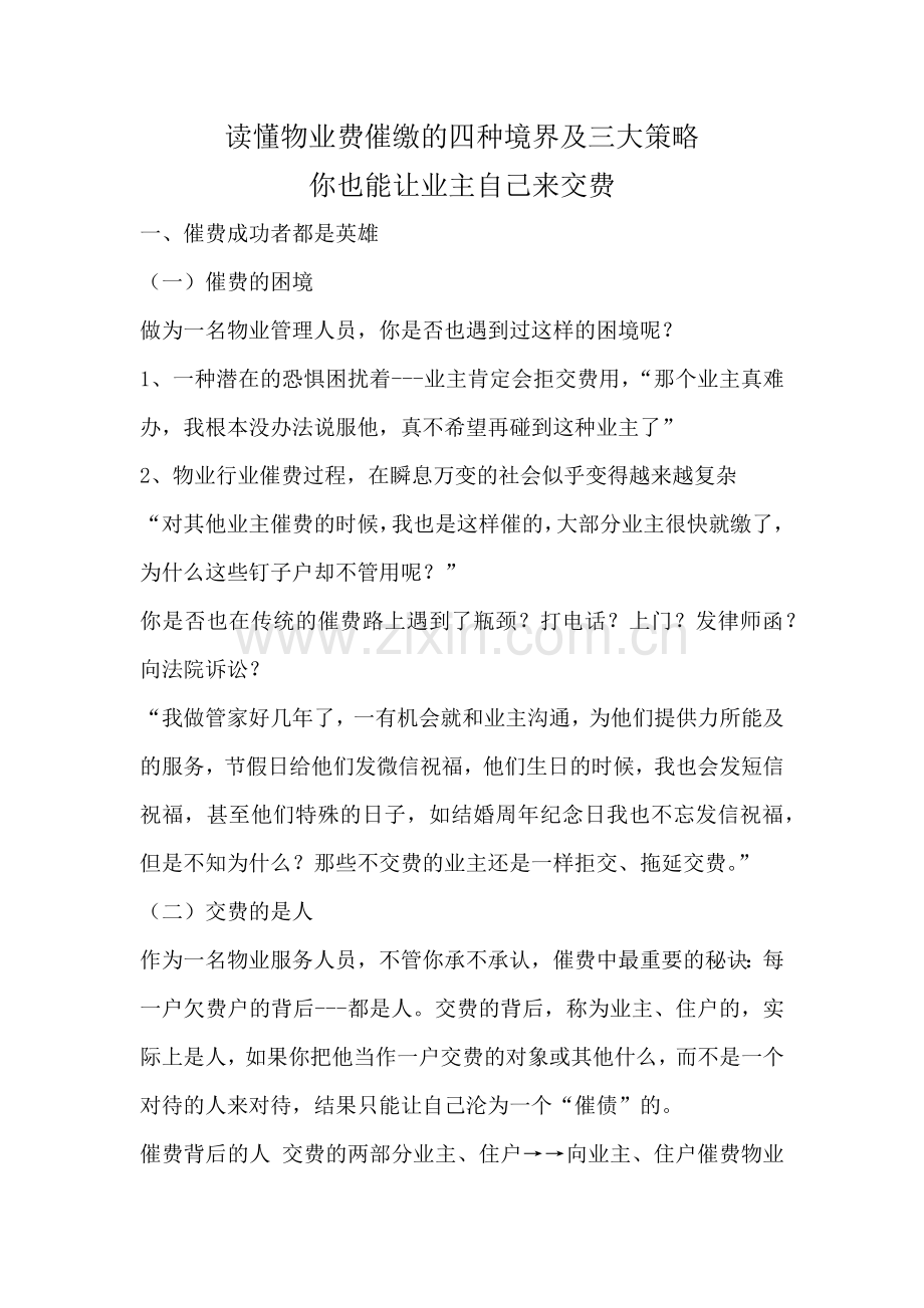 华人首富李嘉诚先生对企业或个人的成功总结为:要有坚定的信念、合理的行动策略,最重要的是---对他人的尊重。物业服务人员在催费过程中,同样要两者兼备。