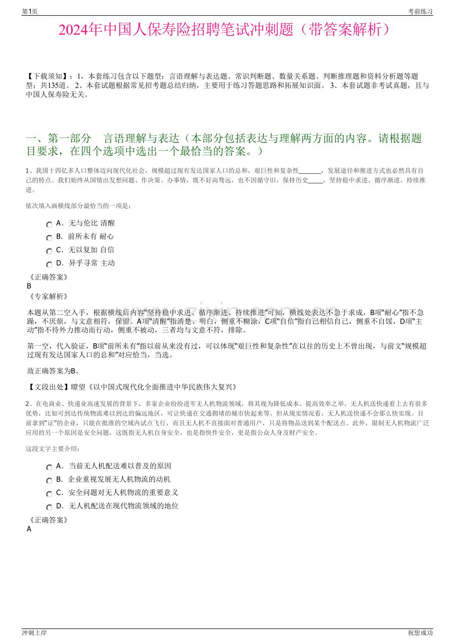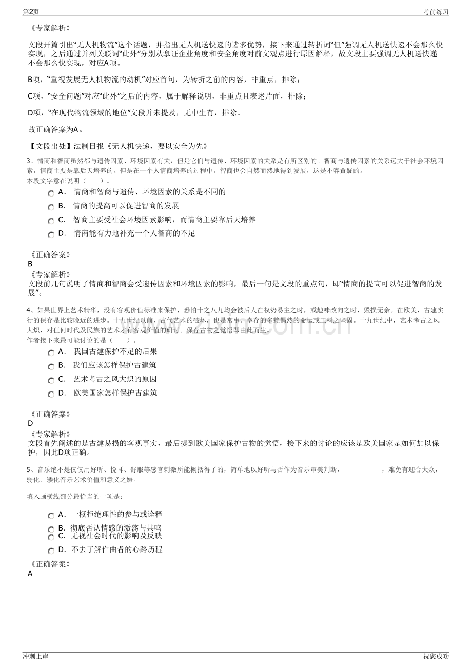 2024年中国人保寿险招聘笔试冲刺题(带答案解析)【下载须知】:1,本套练习包含以下题型:言语理解与表达题、常识判断题、数量关系题、判断推理题和资料分析题等题型;共135道。2、本套试题根据常见招考题总结归纳,主要用于练习答题思路和拓展知识面。3、本套试题非考试真题,且与中国人保寿险无关。一、第一部分言语理解与表达(本部分包括表达与理解两方面的内容。请根据题目要求,在四个选项中选出一个最恰当的答案。)1、我国十四亿多人口整体迈向现代化社会,规模超过现有发达国家人口的总和,艰巨性和复杂性 ,发展途径和推进方式也必然具有自己的特点。我们始终从国情出发想问题、作决策、办事情,既不好高骛远,也不因循守旧,保持历史 ,坚持稳中求进、循序渐进、持续推进。依次填入画横线部分最恰当的一项是:A无与伦比 清醒 B前所未有 耐心 C无以复加 自信 D异乎寻常 主动正确答案B专家解析本题从第二空入手,根据横线后内容“坚持稳中求进、循序渐进、持续推进”可知,横线处表达不急于求成,B项“耐心”指不急躁,不厌烦,与文意相符,保留。A项“清醒”指清楚、明白,侧重不糊涂,C项“自信”指自己相信自己,侧重不自馁,D项“主动”指不待外力推动而行动,侧重不被动,三者均与文意不符,排除。第一空,代入验证,B项“前所未有”指以前从来没有过,可以体现“艰巨性和复杂性”在以往的历史上不曾出现,与前文“规模超过现有发达国家人口的总和”对应恰当,当选。故正确答案为B。【文段出处】瞭望以中国式现代化全面推进中华民族伟大复兴2、在电商业、快递业高速发展的背景下,多家企业纷纷进军无人机物流领域,将其视为降低成本、提高效率之举。无人机送快递看上去有很多优势,比如可到达传统物流难以到达的偏远地区,可让快递在交通拥堵的城市快起来等。但从现实情况看,无人机送快递不会那么快实现。目前拿到“证”的企业,只能在批准的空域内试点飞行,而且无人机不直接面对普通用户,只是将物品送到某个配送点。此外,限制无人机物流广泛应用的另一个原因是安全问题,这既指无人机自身安全,也是指快件安全,更是指公众人身及财产安全。这段文字主要介绍:A当前无人机配送难以普及的原因 B企业重视发展无人机物流的动机 C安全问题对无人机物流的重要意义 D无人机配送在现代物流领域的地位正确答案A第1页考前练习冲刺上岸祝您成功专家解析文段开篇引出“无人机物流”这个话题,并指出无人机送快递的诸多优势,接下来通过转折词“但”强调无人机送快递不会那么快实现,之后通过并列关联词“此外”分别从拿证企业角度和安全角度对前文观点进行原因解释,故文段主要强调无人机送快递不会那么快实现,对应A项。B项,“重视发展无人机物流的动机”对应首句,为转折之前的内容,非重点,排除;C项,“安全问题”对应“此外”之后的内容,属于解释说明,非重点且表述片面,排除;D项,“在现代物流领域的地位”文段并未提及,无中生有,排除。故正确答案为A。【文段出处】法制日报无人机快递,要以安全为先3、情商和智商虽然都与遗传因素、环境因素有关,但是它们与遗传、环境因素的关系是有所区别的。智商与遗传因素的关系远大于社会环境因素,情商主要是靠后天培养的。但是在一个人情商培养的过程中,智商也会自然而然地得到发展,这是不容置疑的。本段文字意在说明()。A 情商和智商与遗传、环境因素的关系是不同的 B 情商的提高可以促进智商的发展 C 智商主要受社会环境因素影响,而情商主要靠后天培养 D 情商能有力地补充一个人智商的不足正确答案B专家解析文段前几句说明了情商和智商会受遗传因素和环境因素的影响,最后一句是文段的重点句,即“情商的提高可以促进智商的发展”。4、如果世界上艺术精华,没有客观价值标准来保护,恐怕十之八九均会被后人在权势易主之时,或趣味改向之时,毁损无余。在欧美,古建实行的保存是比较晚近的进步。十九世纪以前,古代艺术的破坏,也是常事。幸存的多赖偶然的命运或工料之坚固。十九世纪中,艺术考古之风大炽,对任何时代及民族的艺术才有客观价值的研讨。保存古物之觉悟即由此而生。作者接下来最可能讨论的是()。A 我国古建保护不足的后果 B 我们应该怎样保护古建筑 C 艺术考古之风大炽的原因 D 欧美国家怎样保护古建筑正确答案D专家解析文段首先阐述的是古建易损的客观事实,最后提到欧美国家保护古物的觉悟,接下来的讨论的应该是欧美国家是如何加以保护,因此D项正确。5、音乐绝不是仅仅用好听、悦耳、舒服等感官刺激所能概括得了的,简单地以好听与否作为音乐审美判断,难免有迎合大众,弱化、矮化音乐艺术价值和意义之嫌。填入画横线部分最恰当的一项是:A一概拒绝理性的参与或诠释 B彻底否认情感的激荡与共鸣 C无视社会时代的影响及反映 D不去了解作曲者的心路历程正确答案A第2页考前练习冲刺上岸祝您成功专家解析横线在文段中间,应注意与前后文的衔接。横线前指出音乐不是仅仅用感官刺激所能概括的,用好听与否去判断音乐审美,横线后指出横线前论述的做法可能会弱化、矮化音乐艺术价值和意义,故横线处应体现不深入理解音乐、仅以好听与否判断音乐之意,对应A项。B项,横线处意在体现“不深入理解