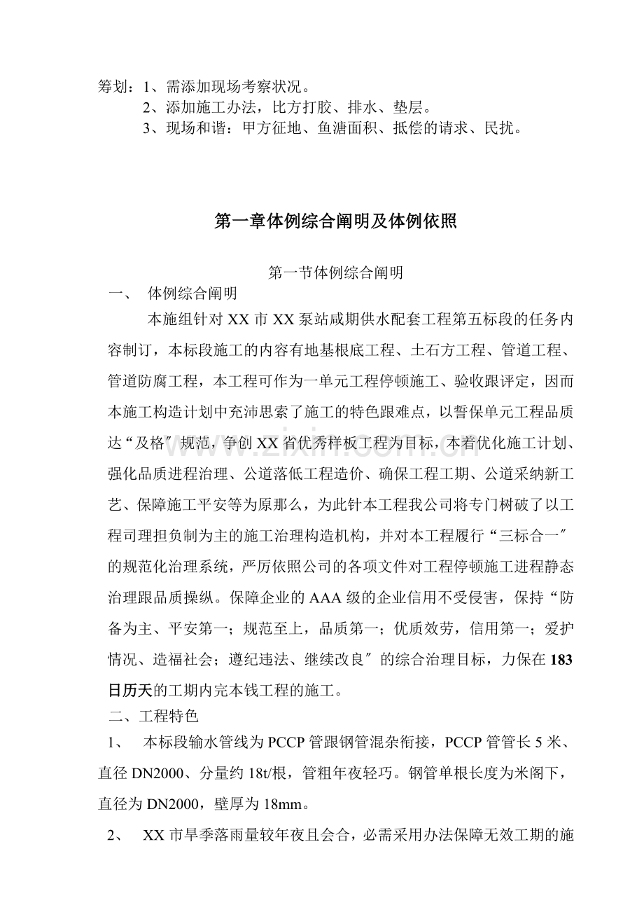 本施组针对XX市XX泵站咸期供水配套工程第五标段的任务内容制订,本标段施工的内容有地基根底工程、土石方工程、管道工程、管道防腐工程,本工程可作为一单元工程停顿施工、验收跟评定,因而本施工构造计划中充沛思索了施工的特色跟难点,以誓保单元工程品质达“及格〞规范,争创XX省优秀样板工程为目标,本着优化施工计划、强化品质进程治理、公道落低工程造价、确保工程工期、公道采纳新工艺、保障施工平安等为原那么,为此针本工程我公司将专门树破了以工程司理担负制为主的施工治理构造机构,并对本工程履行“三标合一〞的规范化治理系统,严厉依照公司的各项文件对工程停顿施工进程静态治理跟品质操纵。保障企业的AAA级的企业信用不受侵害,保持“防备为主、平安第一;规范至上,品质第一;优质效劳,信用第一;爱护情况、造福社会;遵纪违法、继续改良〞的综合治理目标,力保在183日历天的工期内完本钱工程的施工。
