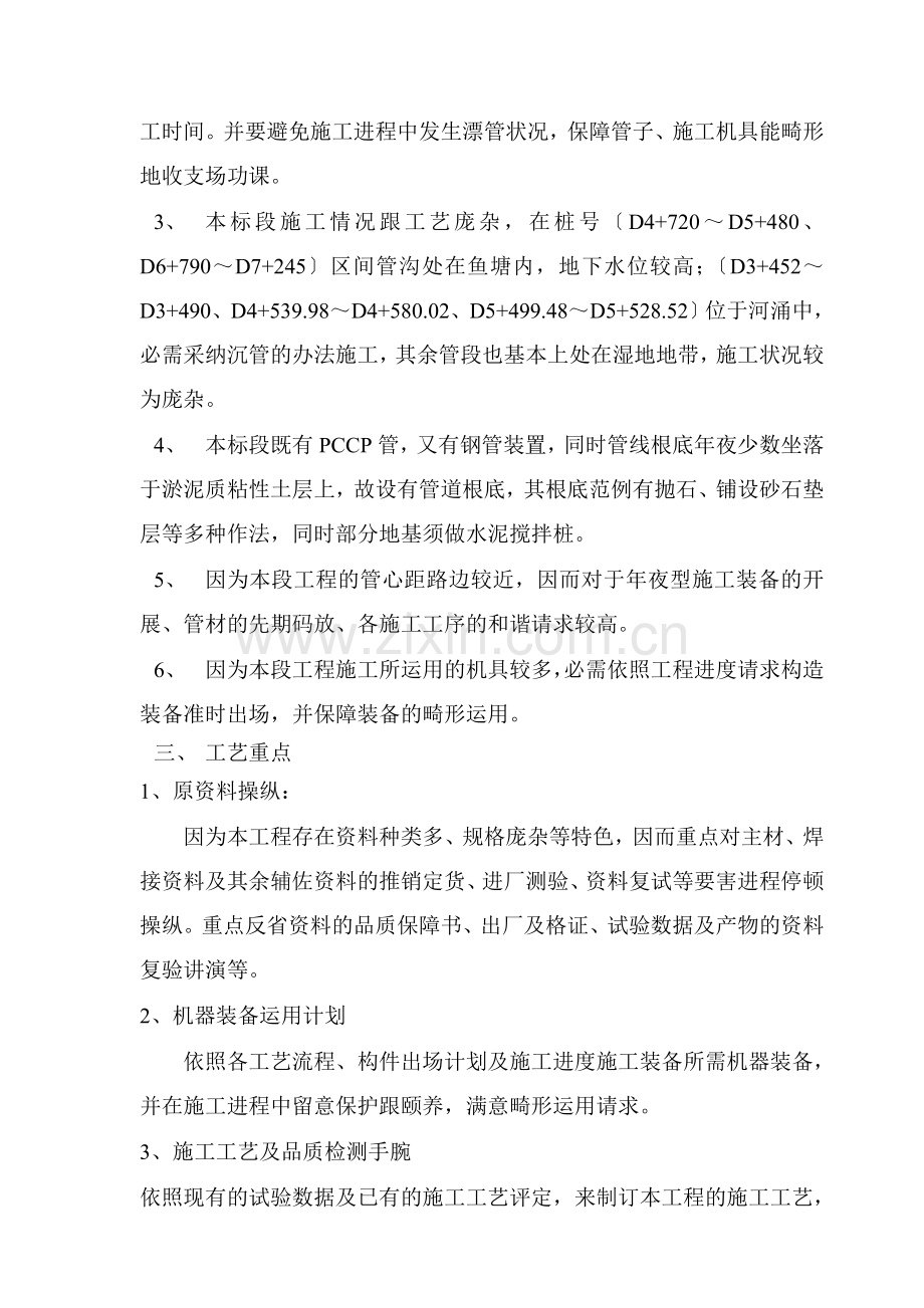 3、 本标段施工情况跟工艺庞杂,在桩号〔D4+720~D5+480、D6+790~D7+245〕区间管沟处在鱼塘内,地下水位较高;〔D3+452~D3+490、D4+539.98~D4+580.02、D5+499.48~D5+528.52〕位于河涌中,必需采纳沉管的办法施工,其余管段也基本上处在湿地地带,施工状况较为庞杂。