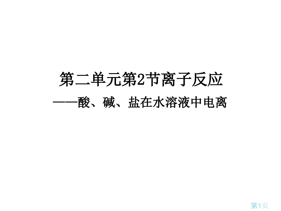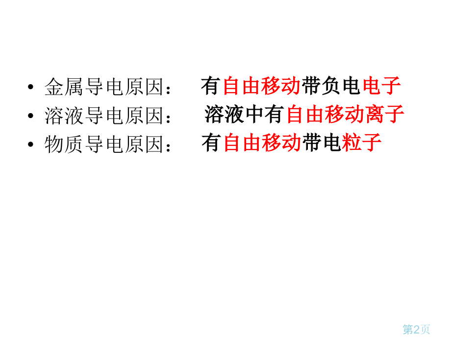 ,单击此处编辑母版标题样式,单击此处编辑母版文本样式,第二级,第三级,第四级,第五级,*,本幻灯片资料仅供参考,不能作为科学依据,如有不当之处,请参考专业资料。,第二单元第2节离子反应,酸、碱、盐在水溶液中电离,第1页,回想,金属导电原因:,溶液导电原因:,物质导电原因:,有,自由移动,带负电,电子,溶液中有,自由移动离子,有,自由移动,带电,粒子,第2页,想一想,第3页,预习检验,电解质:,在,下能够,。,酸、碱、盐在水溶液中能够导电,是因为它们在溶液中发生了,,产生了能够自由移动,。,水溶液里或熔融状态,导电,化合物,电离,离子,第4页,电解质,电解质:,在水溶液,里,或熔融状态下能够导电,化合物,。,比如:,酸:H,2,SO,4,、HNO,3,、HCl等,碱:NaOH、Ca(OH),2,等,盐:NaCl、NaCO,3,等,金属氧化物:CuO、Na,2,O、Fe,2,O,3,等,第5页,思索1,已知铁丝、盐酸都能导电,则Fe和盐酸是电解质吗?,注意:,电解质,研究对象,是,化合物,,,单质和混合物,不是电解质,第6页,思索2,CO,2,和SO,2,水溶液均导电,讨论它们是 电解质吗?,注意,:,必须是在一定条件下因为,本身产生自由移动离子,而导电化合物才能称其为电解质。,第7页,思索3,BaSO,4,(硫酸钡)难溶于水,其水溶液几乎不导电,所以硫酸钡不,是电解质。,注意,:,电解质,导电条件,:,水溶液里或熔融状态下,。,(,只需具备其中之一,),第8页,练习,铜,稀硫酸,氯化氢,氨气,空气,二氧化碳,水银,氯化钠,硫酸钡,氯气,混合物:,电解质但难溶于水:,电解质:,第9页,非电解质,非电解质:,在水溶液,里和,熔融状态下,不,能导电,化合物,。,比如:,部分有机物:蔗糖、酒精、甲烷等,非金属氧化物:CO,2,、NO,2,、P,2,O,5,等,单质和混合物既不是电解质也不是非电解质,第10页,练习,Cu ,固态,NaCl O,2,纯,H,2,SO,4,BaSO,4,酒精水溶液 ,KOH,水溶液,熔融状态,KNO,3,葡萄糖 ,CO,2,电解质:,非电解质:,能导电:,既不是电解质也不是非电解质:,第11页,练一练,判断以下叙述正确,是(),ANaCl溶液能导电,所以NaCl溶液是电解质,B固态NaCl不导电,但NaCl是电解质,CH,2,S水溶液能导电,所以H,2,S是电解质,DSO,3,溶于水能导电,所以SO,3,是电解质,E铜能导电,所以是电解质,FBaSO,4,水溶液不能导电,所以BaSO,4,是非电解质,B、,C,第12页,?,为何电解质固体不能导电,而在水溶液中或熔融状态下能导电呢?,?,?,让我们透过现象来看本质吧!,第13页,NaCl在水中溶解和电离图,第14页,电离,定义:电解质在水溶液里或熔融状态下 离解成自由移动离子过程。,电离方程式:,NaCl=Na,+,+Cl,-,HNO,3,=H,+,+NO,3,-,NaOH=Na,+,+OH,-,化学式,离子符号,第15页,书写电离方程式要注意,1、正确书写离子符号(原子团不拆开),H,2,+,H,2,SO,4,SO,4,2-,+,H,2,SO,4,2H,+,+S,2-,+4O,2-,第16页,惯用原子团离子,酸根离子:NO,3,-,、SO,4,2-,、CO,3,2-,、PO,4,3-,、ClO,3,-,、ClO,-,、MnO,4,-,、MnO,4,2-,氢氧根离子:OH,-,铵根离子:NH,4,+,第17页,书写电离方程式要注意,2.恪守质量守恒和电荷守恒定律,MgCl,2,Mg,2+,+,Cl,-,FeCl,3,Fe,2+,+,3Cl,-,2,3+,第18页,书写电离方程式要注意,3.元素或者原子团化合价等于形成离子电荷数,离子个数用阿拉伯数字标在离子符号之前。,BaSO,4,+2,-2,BaSO,4,Ba,2+,+SO,4,2-,Al(OH),3,Al,3+,+3 OH,-,Al(OH),3,+,3,-1,第19页,酸电离共同特点,HCl,H,+,Cl,-,+,H,2,SO,4,H,+,+,SO,4,2-,电离时生成阳离子,全部,都是,H,+,化合物叫酸,HNO,3,H,+,+,NO,3,-,2,第20页,思索与交流,1、写出NaOH、KOH、Ba(OH),2,在溶液,中电离方程式。,2、写出NH,4,NO,3,、Al,2,(SO,4,),3,、BaCl,2,在,溶液中电离方程式。,请参考酸定义,尝试从电离角度概括出碱和盐本质。,第21页,思索,凡是能电离出H,+,、OH,-,物质一定是 酸或碱吗?,NaHSO,4,Cu,2,(OH),2,CO,3,酸式盐,碱式盐,NaHCO,3,酸式盐,第22页,强电解质和弱电解质,强电解质:,(完全电离),弱电解质:,(部分电离),电,解,质,强酸:盐酸、硫酸、硝酸等,盐,弱酸:碳酸、醋酸等,弱碱:Mg(OH),2,、,NH,3,H,2,O、,Fe(OH),3,水,强碱:NaOH、KOH、Ba(OH),2,等,第23页,HCl电离结果,Cl,-,H,+,液 面,Cl,-,H,+,Cl,-,H,+,Cl,-,H,+,Cl,-,H,+,Cl,-,H,+,Cl,-,H,+,Cl,-,H,+,Cl,-,H,+,Cl,-,H,+,Cl,-,H,+,Cl,-,H,+,Cl,-,H,+,Cl,-,H,+,Cl,-,H,+,Cl,-,H,+,Cl,-,H,+,Cl,-,H,+,Cl,-,H,+,Cl,-,H,+,第24页,CH,3,COOH电离结果,液 面,CH,3,COOH,CH,3,COOH,CH,3,COOH,CH,3,COOH,CH,3,COOH,CH,3,COOH,CH,3,COOH,CH,3,COOH,CH,3,COOH,CH,3,COOH,CH,3,COOH,CH,3,COOH,CH,3,COOH,CH,3,COOH,CH,3,COO,-,CH,3,COO,-,CH,3,COO,-,CH,3,COO,-,H,+,H,+,H,+,H,+,H,+,CH,3,COOH,CH,3,COOH,CH,3,COOH,CH,3,COOH,CH,3,COO,-,第25页,写出以下电离方程式,1.H,2,SO,4,2.Ba(OH),2,3.AlCl,3,4.Na,2,CO,3,5.NaHCO,3,6.NaHSO,4,.KAl(SO,4,),2,H,2,SO,4,=2H,+,+SO,4,2-,Ba(OH),2,=Ba,2+,+2OH,-,AlCl,3,=Al,3+,+3Cl,-,Na,2,CO,3,=2Na,+,+CO,3,2-,NaHCO,3,=Na,+,+HCO,3,-,NaHSO,4,=Na,+,+H,+,+SO,4,2-,KAl(SO,4,),2,=K,+,+Al,3+,+2SO,4,2-,第26页,
