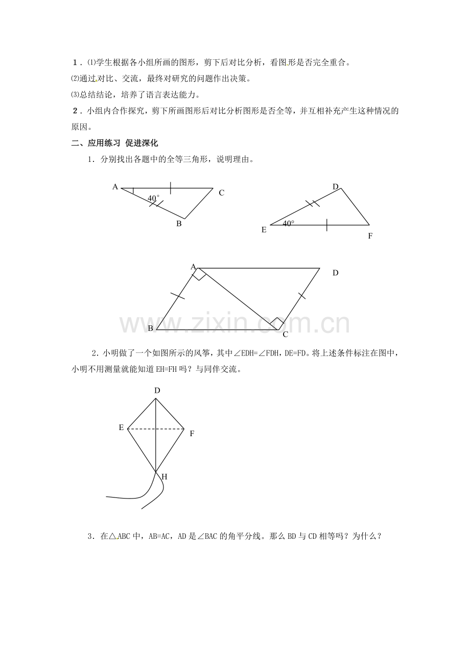 1.⑴学生根据各小组所画的图形,剪下后对比分析,看图形是否完全重合。
