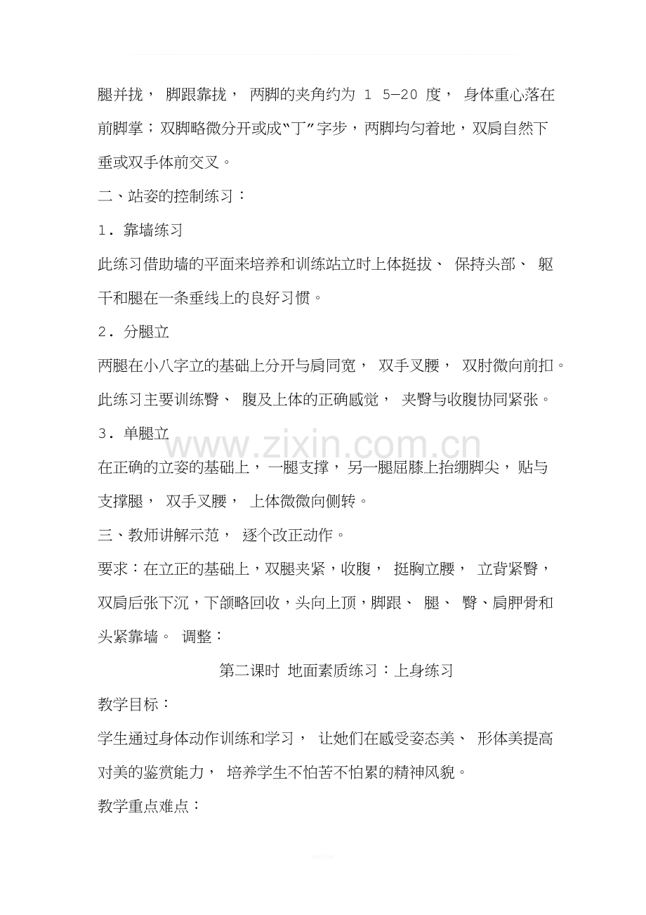 教学目标: 学生通过身体动作训练和学习, 让她们在感受姿态美、 形体美提高对美的鉴赏能力, 培养学生不怕苦不怕累的精神风貌。