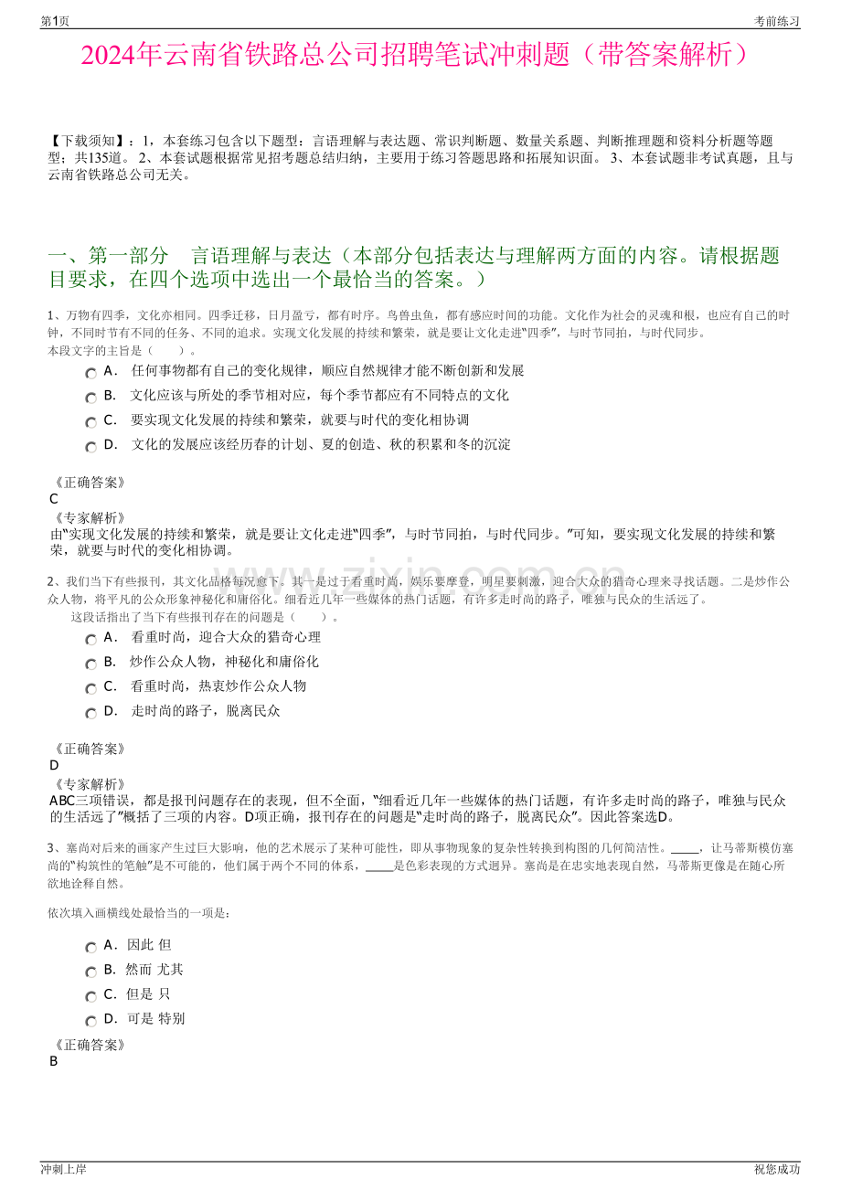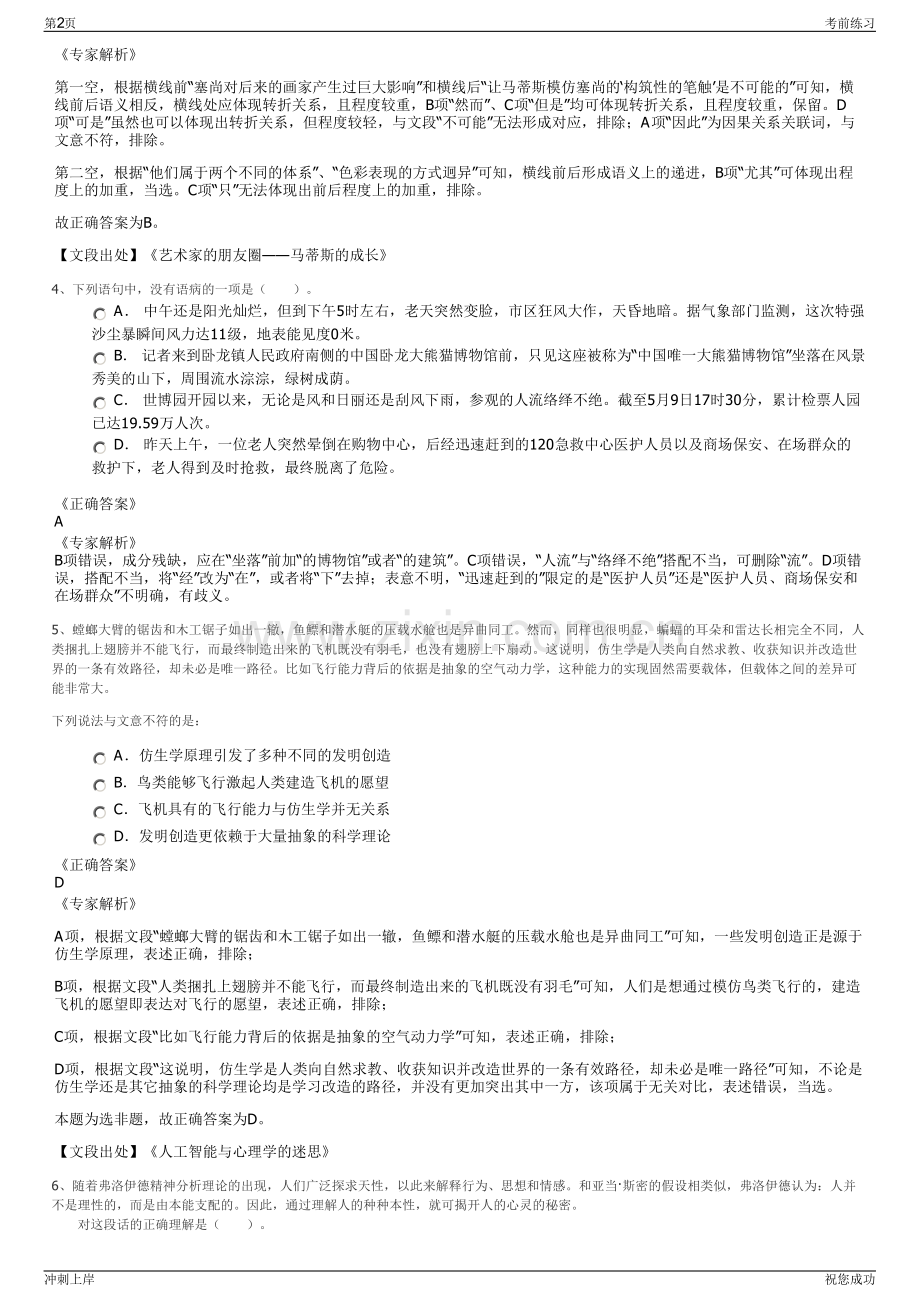 2024年云南省铁路总公司招聘笔试冲刺题(带答案解析)【下载须知】:1,本套练习包含以下题型:言语理解与表达题、常识判断题、数量关系题、判断推理题和资料分析题等题型;共135道。2、本套试题根据常见招考题总结归纳,主要用于练习答题思路和拓展知识面。3、本套试题非考试真题,且与云南省铁路总公司无关。一、第一部分言语理解与表达(本部分包括表达与理解两方面的内容。请根据题目要求,在四个选项中选出一个最恰当的答案。)1、万物有四季,文化亦相同。四季迁移,日月盈亏,都有时序。鸟兽虫鱼,都有感应时间的功能。文化作为社会的灵魂和根,也应有自己的时钟,不同时节有不同的任务、不同的追求。实现文化发展的持续和繁荣,就是要让文化走进“四季”,与时节同拍,与时代同步。本段文字的主旨是()。A 任何事物都有自己的变化规律,顺应自然规律才能不断创新和发展 B 文化应该与所处的季节相对应,每个季节都应有不同特点的文化 C 要实现文化发展的持续和繁荣,就要与时代的变化相协调 D 文化的发展应该经历春的计划、夏的创造、秋的积累和冬的沉淀正确答案C专家解析由“实现文化发展的持续和繁荣,就是要让文化走进“四季”,与时节同拍,与时代同步。”可知,要实现文化发展的持续和繁荣,就要与时代的变化相协调。2、我们当下有些报刊,其文化品格每况愈下。其一是过于看重时尚,娱乐要摩登,明星要刺激,迎合大众的猎奇心理来寻找话题。二是炒作公众人物,将平凡的公众形象神秘化和庸俗化。细看近几年一些媒体的热门话题,有许多走时尚的路子,唯独与民众的生活远了。这段话指出了当下有些报刊存在的问题是()。A 看重时尚,迎合大众的猎奇心理 B 炒作公众人物,神秘化和庸俗化 C 看重时尚,热衷炒作公众人物 D 走时尚的路子,脱离民众正确答案D专家解析ABC三项错误,都是报刊问题存在的表现,但不全面,“细看近几年一些媒体的热门话题,有许多走时尚的路子,唯独与民众的生活远了”概括了三项的内容。D项正确,报刊存在的问题是“走时尚的路子,脱离民众”。因此答案选D。3、塞尚对后来的画家产生过巨大影响,他的艺术展示了某种可能性,即从事物现象的复杂性转换到构图的几何简洁性。,让马蒂斯模仿塞尚的“构筑性的笔触”是不可能的,他们属于两个不同的体系,是色彩表现的方式迥异。塞尚是在忠实地表现自然,马蒂斯更像是在随心所欲地诠释自然。依次填入画横线处最恰当的一项是:A因此 但 B然而 尤其 C但是 只 D可是 特别正确答案B第1页考前练习冲刺上岸祝您成功专家解析第一空,根据横线前“塞尚对后来的画家产生过巨大影响”和横线后“让马蒂斯模仿塞尚的构筑性的笔触是不可能的”可知,横线前后语义相反,横线处应体现转折关系,且程度较重,B项“然而”、C项“但是”均可体现转折关系,且程度较重,保留。D项“可是”虽然也可以体现出转折关系,但程度较轻,与文段“不可能”无法形成对应,排除;A项“因此”为因果关系关联词,与文意不符,排除。第二空,根据“他们属于两个不同的体系”、“色彩表现的方式迥异”可知,横线前后形成语义上的递进,B项“尤其”可体现出程度上的加重,当选。C项“只”无法体现出前后程度上的加重,排除。故正确答案为B。【文段出处】艺术家的朋友圈马蒂斯的成长4、下列语句中,没有语病的一项是()。A 中午还是阳光灿烂,但到下午5时左右,老天突然变脸,市区狂风大作,天昏地暗。据气象部门监测,这次特强沙尘暴瞬间风力达11级,地表能见度0米。B 记者来到卧龙镇人民政府南侧的中国卧龙大熊猫博物馆前,只见这座被称为“中国唯一大熊猫博物馆”坐落在风景秀美的山下,周围流水淙淙,绿树成荫。C 世博园开园以来,无论是风和日丽还是刮风下雨,参观的人流络绎不绝。截至5月9日17时30分,累计检票人园已达19.59万人次。D 昨天上午,一位老人突然晕倒在购物中心,后经迅速赶到的120急救中心医护人员以及商场保安、在场群众的救护下,老人得到及时抢救,最终脱离了危险。正确答案A专家解析B项错误,成分残缺,应在“坐落”前加“的博物馆”或者“的建筑”。C项错误,“人流”与“络绎不绝”搭配不当,可删除“流”。D项错误,搭配不当,将“经”改为“在”,或者将“下”去掉;表意不明,“迅速赶到的”限定的是“医护人员”还是“医护人员、商场保安和在场群众”不明确,有歧义。5、螳螂大臂的锯齿和木工锯子如出一辙,鱼鳔和潜水艇的压载水舱也是异曲同工。然而,同样也很明显,蝙蝠的耳朵和雷达长相完全不同,人类捆扎上翅膀并不能飞行,而最终制造出来的飞机既没有羽毛,也没有翅膀上下扇动。这说明,仿生学是人类向自然求教、收获知识并改造世界的一条有效路径,却未必是唯一路径。比如飞行能力背后的依据是抽象的空气动力学,这种能力的实现固然需要载体,但载体之间的差异可能非常大。下列说法与文意不符的是:A仿生学原理引发了多种不同的发明创造 B鸟类能够飞行激起人类建造飞机的愿望 C飞机具有的飞行能力与仿生学并无关系 D发明创造更依赖于大量抽象的科学理论正确答案D专家解析A项,根据文段“螳螂大臂的锯齿和木工锯子如出一辙,鱼鳔和潜水艇的压载水舱也是异曲同工”可知,一些发明创造正是源于仿生学原理,表述正确,排除;B项,根据文段
