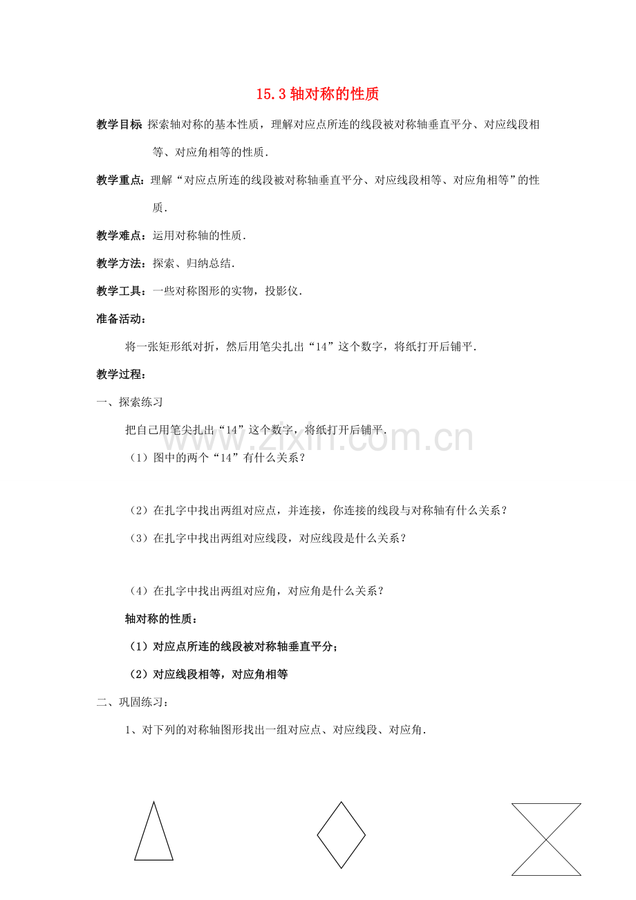 教学目标:探索轴对称的基本性质,理解对应点所连的线段被对称轴垂直平分、对应线段相等、对应角相等的性质.
