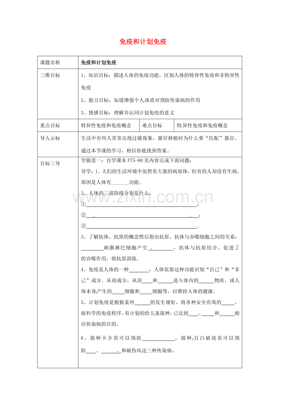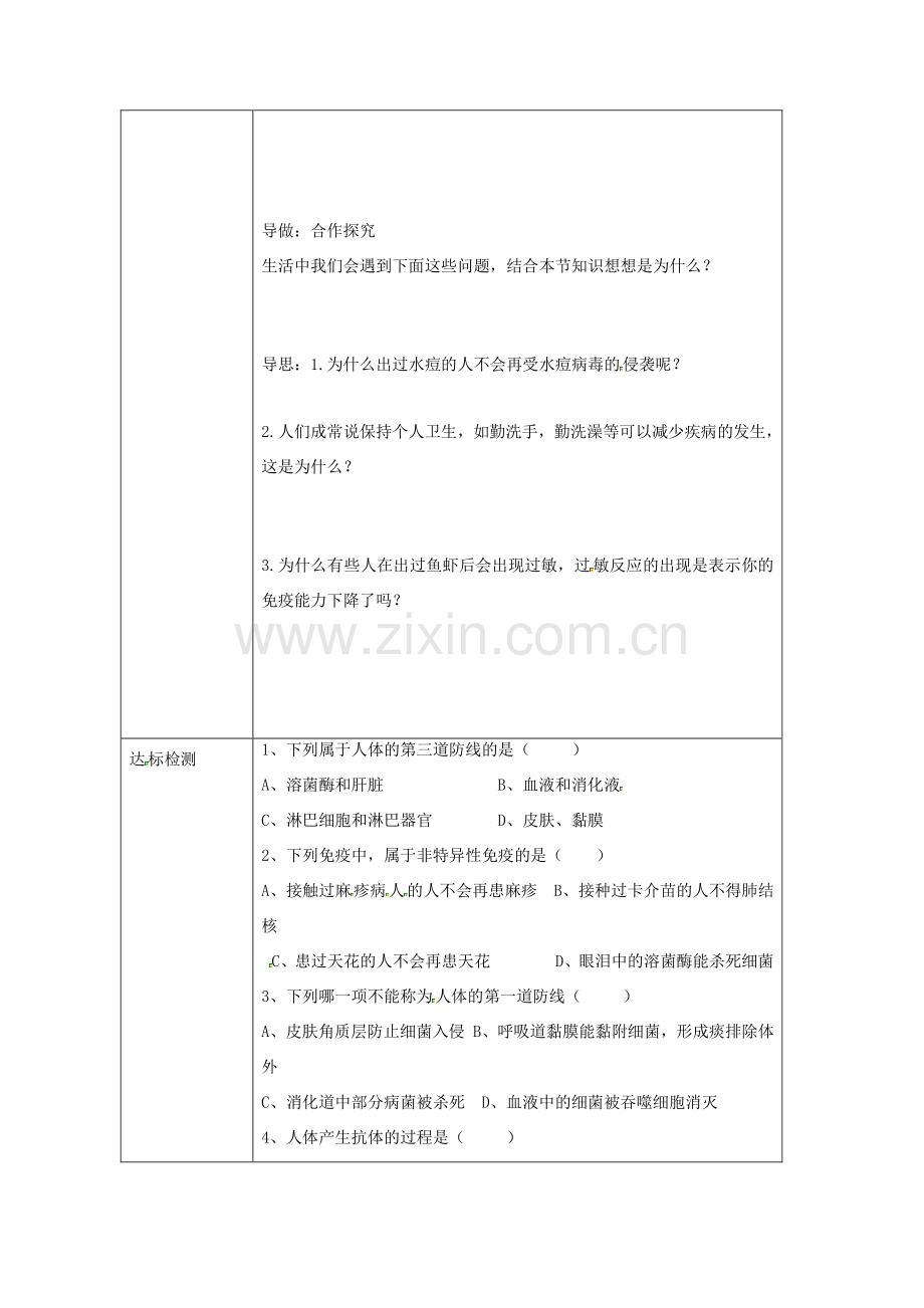 免疫和计划免疫免疫和计划免疫 课题名称 免疫和计划免疫免疫和计划免疫 三维目标 1、知识目标:描述人体的免疫功能,区别人体的特异性免疫和非特异性免疫 2、能力目标:知道增强个人体质对预防传染病的作用 3、情感目标:理解并认同计划免疫的意义 重点目标 特异性免疫和免疫概念 难点目标 特异性免疫和免疫概念 导入示标 生活中有些人常常出现过敏现象,器官移植时为什么要“匹配”器官,通过本节课的学习,相信你能找到答案。目标三导 学做思一:自学课本 P75-80 页内容完成下面问题:导学:1、人们的生活环境中虽然有大量的病原体,但有的人却没有生病,原因是人体有_功能。2、人体的三道防线分别是什么:;。3、了解抗体、抗原的概念然后指出抗原、抗体与吞噬细胞之间的关系:刺激淋巴细胞产生 ,抗体与抗原结合,促进了 的吞噬作用,将抗原清除。4、免疫是人体的一种 ,人体依靠这种功能识别“自己”和“非己”成分,从而成分,从而 和 进入体内的 物质,或人体本身产生的 细胞和 细胞等,以维持人体的健康。5、计划免疫是根据某些 的发生规矩,将各种安全有效的 ,按科学的免疫程序,有计划的给儿童接种,已达到 、和 相应传染病的目的。6、接种卡介苗可以预防 ,接种 百白破疫苗可以预防 、和破伤风这三种传染病。导做:合作探究 生活中我们会遇到下面这些问题,结合本节知识想想是为什么?导思:1.为什么出过水痘的人不会再受水痘病毒的侵袭呢?2.人们成常说保持个人卫生,如勤洗手,勤洗澡等可以减少疾病的发生,这是为什么?3.为什么有些人在出过鱼虾后会出现过敏,过敏反应的出现是表示你的免疫能力下降了吗?达标检测 1、下列属于人体的第三道防线的是()A、溶菌酶和肝脏 B、血液和消化液 C、淋巴细胞和淋巴器官 D、皮肤、黏膜 2、下列免疫中,属于非特异性免疫的是()A、接触过麻疹病人的人不会再患麻疹 B、接种过卡介苗的人不得肺结核 C、患过天花的人不会再患天花 D、眼泪中的溶菌酶能杀死细菌 3、下列哪一项不能称为人体的第一道防线()A、皮肤角质层防止细菌入侵 B、呼吸道黏膜能黏附细菌,形成痰排除体外 C、消化道中部分病菌被杀死 D、血液中的细菌被吞噬细胞消灭 4、人体产生抗体的过程是()A、抗原淋巴细胞抗体 B、抗原胸腺抗体 C、抗原脾脏抗体 D、抗原淋巴结抗体 5、皮肤的保护作用,泪液的杀菌作用都属于人体的()A、非特异性免疫 B、特异性免疫 C、第二道防线 D、第三道防线 6、下列属于特异性免疫的是 A、黏膜分泌物具有杀菌作用 B、唾液中溶菌酶溶解病菌 C、呼吸道黏膜上的纤毛清扫异物 D、患过天花的人以后不会再患天花 反思总结 1.知识建构:比较清晰 2.能力提高:很快 3.课堂体验:丰富 课后练习 1、保卫人体的第一道防线是 和 。体液中的 和 是保卫人 体的第二道防线。2、非特异性免疫的特点是,人人 就有,不针对某一特定的 ,而是对多种 都有防御作用。3、人体的第三道防线主要由 和 组成的。4、病原体入侵到人体内刺激 淋 巴细胞,淋巴细胞就会产生一种抵抗该病原体的特殊蛋白质,叫做 。引起人体产生抗体的物质叫做 。