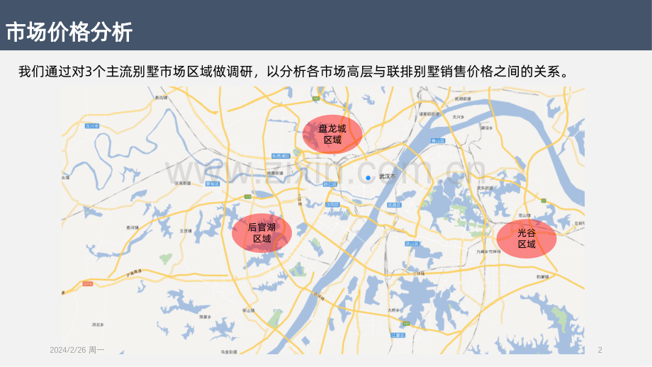 2 0 1 8年 6 月高层与联排产品高层与联排产品价格关系调研价格关系调研2024/2/26 周一1市场价格分析市场价格分析我们通过对3个主流别墅市场区域做调研,以分析各市场高层与联排别墅销售价格之间的关系。后官湖区域光谷区域盘龙城区域2024/2/26 周一21 1、盘龙城市场、盘龙城市场盘龙城是一个拥有多种住宅业态的典型区域,将其作为标本区域进行分析,并以以下几种标杆项目作为重点分析对象:聚龙花园衡山公馆聚龙花园衡山公馆联排、双拼共1.4万方山海观山海观高层、花园洋房、联排别墅共54万方盘龙城中心城区盘龙城中心城区(限购)(限购)高层、联排综合住宅高层、联排综合住宅高层住宅高层住宅联排、独栋联排、独栋盘龙城遗址公园盘龙城遗址公园德成红墅德成红墅洋房、独栋别墅共2万方翰林公馆翰林公馆高层住宅10万方天汇龙城天汇龙城高层住宅20万方2024/2/26 周一3区域别墅市场情况:区域别墅市场情况:项目基本信息开发商湖北恒鑫房地产开发有限公司项目地址横山小路(第一医院盘龙城分院康复中心对面)物业类别别墅建筑类型联排双拼总建面13824平方米容积率0.87绿化率50%总户数51入市时间2016年8月装修情况毛坯主力产品257346车位总停车位数为102,车位比1:2物业公司武汉福赛德物业管理有限公司聚龙花园衡山公馆:聚龙花园衡山公馆:以联排为主打造的纯别墅居住区,其中建面252346每户实得面积在400500不等,地下面积(另包括2个地下停车位)、露台面积和院落面积均为赠送面积,每户花园90220不等,联排别墅毛坯均价在联排别墅毛坯均价在1700017000元元/1 1、盘龙城市场、盘龙城市场2024/2/26 周一4区域别墅市场情况:区域别墅市场情况:项目基本信息开发商中和瑞兴房地产开发有限公司项目地址巨龙大道39号物业类别花园洋房,独栋建筑类型板楼低层多层总建面20761平方米容积率1.05绿化率40%总户数136入市时间2018年3月装修情况毛坯主力产品169241停车位地面停车135个,地下停车267个物业公司浙江绿城物业管理有限公司德成红墅:德成红墅:是集洋房、别墅于一体的高端物业项目,小区共2栋6层洋房,9栋别墅。5月25日开盘,推H1、H2号楼108-125洋房、L1-L3、L5A、L5-L8#楼146-242叠拼、D1#楼206.2双拼,洋房均价9500元/,去化率100%;联排联排别墅毛坯别墅毛坯均价均价1850018500元元/,去化9套,整体去化率42%1 1、盘龙城市场、盘龙城市场2024/2/26 周一5区域别墅市场情况:区域别墅市场情况:项目基本信息开发商武汉恒安投资有限公司项目地址盘龙大道汤云海路(地铁2号线盘龙城站B出口附近)物业类别普通住宅,花园洋房,联排,双拼建筑类型板楼低层高层超高层总建面540000平方米容积率2.87绿化率40%总户数5080入市时间2017年7月装修情况精装主力产品77270物业公司浙江绿城物业管理有限公司山海观:山海观:打造54万方低密墅区大城,依山傍水,背倚露甲山,面朝汤仁海,产品类型涵盖有高层、花园洋房、联排别墅、双拼别墅,即将开盘联排别墅类产品面积大小为270,联排别墅毛坯均价在联排别墅毛坯均价在2000020000元元/1 1、盘龙城市场、盘龙城市场2024/2/26 周一6区域高层住宅市场情况:区域高层住宅市场情况:项目基本信息开发商武汉恒安投资有限公司项目地址盘龙大道汤云海路(地铁2号线盘龙城站B出口附近)物业类别普通住宅,花园洋房,联排,双拼建筑类型板楼低层高层超高层总建面540000平方米容积率2.87绿化率40%总户数5080入市时间2017年7月装修情况精装主力产品77270物业公司浙江绿城物业管理有限公司山海观:山海观:打造54万方低密墅区大城,依山傍水,背倚露甲山,面朝汤仁海。产品类型涵盖有高层、花园洋房、联排别墅、双拼别墅。其中高层类产品面积集中在77-126,高层毛坯均价在高层毛坯均价在1 100000000元元/(另加(另加25002500元精元精装)装)1 1、盘龙城市场、盘龙城市场2024/2/26 周一7区域高层住宅市场情况:区域高层住宅市场情况:项目基本信息开发商武汉地产控股有限公司项目地址盘龙城巨龙大道90号物业类别普通住宅建筑类型板楼多层小高层高层超高层总建面199777平方米容积率2.49绿化率34%入市时间2017年5月装修情况毛坯总户数1193主力产品100-133车位1726个(三期)物业公司武汉地产集团东方物业管理有限公司天汇龙城天汇龙城:周边配套完善,产品线丰富,洋房、小高、高层、写字楼、商业兼具。整体规划错落有致,项目三期有八栋,主力户型为建面约96、116、130平户三房户型产品,高层毛坯均价在高层毛坯均价在80008000元元/1 1、盘龙城市场、盘龙城市场2024/2/26 周一8区域高层住宅市场情况:区域高层住宅市场情况:项目基本信息开发商武汉盘龙卓尔置业有限公司项目地址巨龙大道黄陂一中旁(恒大名都小区对面)物业类别普通住宅建筑类型板楼高层超高层总建面100000平方米容积率2.17绿化率32%入市时间2017年7月装修情况精装总户数654主力产品89-139车位553个(三期)物业公司香港恒卓翰林公馆翰林公馆:10万方精装高层住宅,主力户型在88-139,周边配套完善,项目紧临盘龙一中,高层毛坯高层毛坯均价在均价在80008000元元/(另加(另加20002000元精装)元精装)1 1、盘龙城市场、盘龙城市场2024/2/26 周一9盘龙城区域别墅与高层产品价格关系:盘龙城区域别墅与高层产品价格关系:区域内高层住宅去化状况良好,基本达到开盘80%以上去化,去化周期短。联排、独栋别墅整体去化状况欠佳,年均去化速