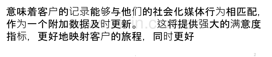 未来五年我们可以期望看到什么?1、社会化媒体被映射到客户视图当中 市场上存在很多社会化媒体聆听工具,但是在未来5年,变化将增加。这1.意味着客户的记录能够与他们的社会化媒体行为相匹配,作为一个附加数据及时更新。这将提供强大的满意度指标,更好地映射客户的旅程,同时更好2.地利用倡导者和有影响力的人。当然,所有这些额外的数据需要被管理以符合相关的数据保护法律。越来越多的国家要求存储在服务器上的其公民个人3.数据是安全的。很多企业很可能需要创建更多的数据保护方法和流程来跟上潜在的变化。2、认知CRM使销售合理化今天数字化的消费者对客户4.服务有很高的期望。在一个理想的世界里,座席可以打开一个仪表板,那里包括了所有的客户信息,这些信息使他们能够回答客户的查询和进行个性化5.的交互。认知CRM还可以提高客户的满意度,减少联络中心座席的负担,使他们能够专注于更复杂的需要人类帮助的客户咨询。例如,如果一个消6.费者在联系他们的手机提供商时,认知CRM系统会自动识别出客户的合同是否将到期,如果是的话,将推荐一个合适的产品套餐报价。3、人工智能7.在理解性格上将取得进展人工智能和认知解决方案越来越多,利用机器学习来确定客户真正的意图并提供准确的个性化答案-从本质上理解人的意图8.,而不仅仅是他们说了什么。我们将会看到这些工具为联络中心开发出可以提供更具预测洞察力的解决方案。最有用的工具之一是能够实时监控热点问9.题,这将通过识别异常的趋势来提醒座席。4、系统数据的整体视图CRM系统仅仅当你把信息放入之后才起作用。大多数CRM使用者会拖延更新10.系统(如果她们这样做了)的时间,这将导致不满意的客户选择离开。业务自动化软件,例如帕克软件的ThinkAutomation,可以自动地11.更新CRM系统,而不需要人工的干预,把时间释放出来用于采取行动而不是进行管理。自动化软件可以改变你的CRM系统,使其不再仅仅是一个简12.单的数据库工具,这样可以提高客户的满意度,产生销售额和增加员工士气。这个软件可以自动化全过程,如根据网上销售结果建立新客户资料,从网络13.表格数据中更新客户的联系信息,等等。我们已经开始看到一个增强型CRM相关的业务流程自动化开始使用。企业正在发现越来越智能的方法来将C14.RM数据与现有的应用程序集成,优化整体客户体验。不论是否将CRM与即时聊天软件相连接来监控客户满意度并触发后续调用,还是利用反向连接I15.P查找技术自动地与网站销售团队联系,很显然的是,未来自动化是CRM系统价值最大化的关键。随着商业自动化软件与许多CRM系统用户发生了16.关联,问题出现了:下一个是什么?自动化软件为人工智能软件奠定了基础。没有自动化,企业将难以维系人工智能所需的大量数据,所以不在现有CR17.M系统中添加自动化元素的企业将在AI时代遇到困难。5、个性化交互服务 服务代表将在与每一位客户交互时被提供自动化的实时指导,这样使企18.业能够更好地提供个性化的通信。例如:如果客户提到一个特定的产品,服务代表可能会得到一个有关这一产品的详细提示。如果客户的合同即将到期19.,服务代表可以被提醒来建议客户续约。6、捕捉声音数据变得如同捕获文本一样地容易最近语音识别技术的进步可以以前所未有的精度来进行口语20.对话的识别。将音频转换为文本,使其语言内容变得可访问以适应各种各样的分析技术,推断客户的意图,建议最好的行动,追踪问题解决的进展情况21.,并评估服务代表的效率。在许多对话中收集的事件序列可用于更好地理解客户的行为,同时给予服务代表应如何回应的建议。7、物联网开始做出22.真正的贡献物联网(IoT)意味着大多数设备现在可以记录、分析和反馈宝贵的数据。这些数据将开始融入到CRM系统当中,这将为销售人员提供23.更多有用的信息。如果你五年前卖出了一个锅炉,今年你可能给这个客户打了电话,因为这是普通锅炉能持续的平均年限。但是,大数据将开始彻底改24.变客户关系管理,为联络中心提供预测,这要感谢数据与CRM系统的集成。随着物联网的日益广泛采用,聊天机器人可以获得添加到CRM系统中的25.信息,用于进一步满足客户的需求。26.odoo https:/cdn.openerp.hk27.谢谢观看!