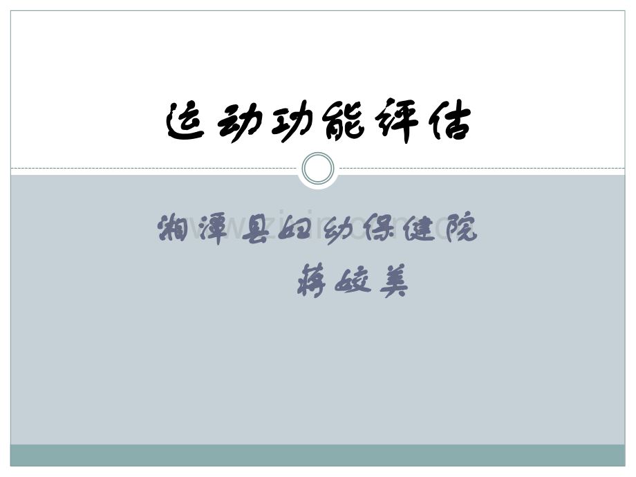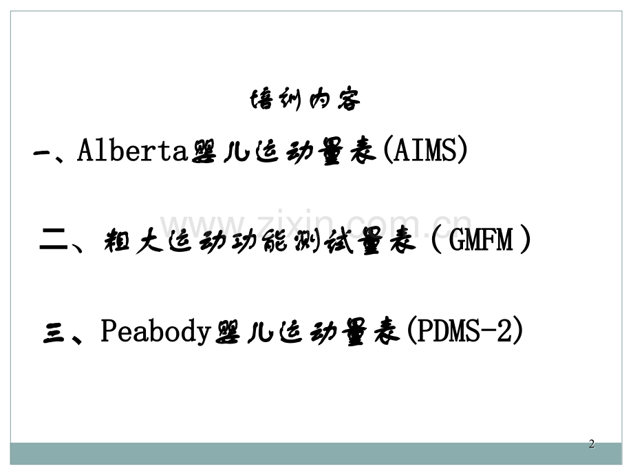 运动功能评估运动功能评估湘潭县妇幼保健院湘潭县妇幼保健院 蒋姣美蒋姣美2 2 培训内容培训内容 一一、AlbertaAlberta婴儿运动量表婴儿运动量表(AIMS)(AIMS)二二、粗大运动功能测试量表粗大运动功能测试量表(GMFMGMFM)三三、PeabodyPeabody婴儿运动量表婴儿运动量表(PDMS-2)(PDMS-2)3 3AlbertaAlberta婴儿运动量表婴儿运动量表(AIMS)(AIMS)AlbertaAlberta婴儿运动量表婴儿运动量表(Albertalnfant Motor(Albertalnfant Motor ScaleScale,AIMS)AIMS)是一个通过观察来评估是一个通过观察来评估0 01818个个月龄或从出生到独立行走这段时期婴儿运动月龄或从出生到独立行走这段时期婴儿运动发育的工具。发育的工具。AIMSAIMS的内容的内容该量表包括该量表包括5858个项目,分为个项目,分为4 4个亚单元:个亚单元:俯卧位:俯卧位:2121个个仰卧位:仰卧位:9 9个个坐位:坐位:1212个个站立位:站立位:1616个个适用对象适用对象识别运动发育迟缓:所有识别运动发育迟缓:所有1818月龄的婴儿月龄的婴儿评估运动发育随时间的进步:无异常运动模式的所有评估运动发育随时间的进步:无异常运动模式的所有1818月龄的婴儿月龄的婴儿AIMSAIMS的特点的特点对每一项技能从负重、姿势及抗重力运动三方面特征进行评对每一项技能从负重、姿势及抗重力运动三方面特征进行评估,故可较早地识别出运动发育不成熟或运动模式异常的婴估,故可较早地识别出运动发育不成熟或运动模式异常的婴儿。儿。可以敏感地反映出婴儿在短时间内所发生的运动发育微小变可以敏感地反映出婴儿在短时间内所发生的运动发育微小变化,故可精确地评估婴儿运动发育成熟的水平以及在干预治化,故可精确地评估婴儿运动发育成熟的水平以及在干预治疗后的变化。疗后的变化。不仅关注运动技能的发育速度,它更具优势的是观察运动技不仅关注运动技能的发育速度,它更具优势的是观察运动技能的缺失或异常的成分,因此,为干预方案的制定尤其是干能的缺失或异常的成分,因此,为干预方案的制定尤其是干预要点的选择提供了有价值的参考信息。预要点的选择提供了有价值的参考信息。不适用于运动发育处于婴儿期的年长儿童或有异常运动模式不适用于运动发育处于婴儿期的年长儿童或有异常运动模式的婴儿的运动发育监测评估的婴儿的运动发育监测评估 评估方法评估方法AIMSAIMS评估过程完全由婴儿启动和完成各项运动,评估过程完全由婴儿启动和完成各项运动,治疗师(评估人)只是观察和分析婴儿的运动。治疗师(评估人)只是观察和分析婴儿的运动。除外一些特定项目(项目中明确提示)需要体位除外一些特定项目(项目中明确提示)需要体位摆放或躯体诱导。摆放或躯体诱导。评分:评分:该量表包括该量表包括5858个项目,分为俯卧位、仰卧位、坐个项目,分为俯卧位、仰卧位、坐位及站立位位及站立位4 4个亚单元,每个项目限定两个评分等个亚单元,每个项目限定两个评分等级:级:“观察到观察到”或或“未观察到未观察到”评估方法评估方法评分:评分:每个体位下均找出观察到的最不成熟和最成熟的项每个体位下均找出观察到的最不成熟和最成熟的项目,从而设定运动技能目,从而设定运动技能“窗窗”,窗前的每个项目均,窗前的每个项目均得分,窗内的每个项目都应逐一检测。得分,窗内的每个项目都应逐一检测。计算出四个体位的原始分总和后,通过与常模比较计算出四个体位的原始分总和后,通过与常模比较得出婴儿在同龄儿中所处的百分位,由此判断婴儿得出婴儿在同龄儿中所处的百分位,由此判断婴儿运动发育水平。运动发育水平。评估方法评估方法早产儿须纠正胎龄至40周例如:胎龄34+4周年月日评估日期20131030出生日期2013612实际年龄418校正年龄3 8周天397344 5月3天 110评估结果解释评估结果解释根据年龄分层及根据年龄分层及AIMSAIMS得分可以确定目前婴儿运动发得分可以确定目前婴儿运动发育所处百分位育所处百分位百分位越高,发生运动发育异常的风险越小;百分百分位越高,发生运动发育异常的风险越小;百分位越低,运动发育程度就越低位越低,运动发育程度就越低通常将百分位通常将百分位5 5或或1010作为运动发育异常的判断作为运动发育异常的判断标准,将高危儿分为运动发育正常、可疑、异常。标准,将高危儿分为运动发育正常、可疑、异常。AIMS的临床应用的临床应用 评估婴幼儿的运动发育评估婴幼儿的运动发育评估婴幼儿的运动发育评估婴幼儿的运动发育 监测婴幼儿的运动发育变化监测婴幼儿的运动发育变化监测婴幼儿的运动发育变化监测婴幼儿的运动发育变化 识别运动发育及运动模式是否正常识别运动发育及运动模式是否正常识别运动发育及运动模式是否正常识别运动发育及运动模式是否正常 制定治疗目标和干预策略制定治疗目标和干预策略制定治疗目标和干预策略制定治疗目标和干预策略 研究工具研究工具研究工具研究工具粗大运动功能测试量表粗大运动功能测试量表(GMFMGMFM)粗大运动功能测试量表粗大运动功能测试量表(gross motor function(gross motor function measure,GMFM)measure,GMFM)主要用于测量主要用于测量0-60-6岁脑瘫患儿的粗大岁脑瘫患儿的粗大运动状况、随时间出现或由于干预而出现的运动功运动状况、随时间出现或由于干预而出现的运动功能改变能改变,是目前脑瘫患儿粗大功能