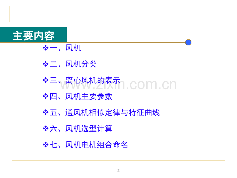 1风机选型及计算2主要内容主要内容v一、风机v二、风机分类v三、离心风机的表示v四、风机主要参数v五、通风机相似定律与特征曲线v六、风机选型计算v七、风机电机组合命名3干法干法脱硫脱硫半干法半干法脱脱湿法湿法脱脱v一、风机 风机是输送气体的机械总称。风机是一种通用工业设备产品,用途非常广泛,公共的、商业的民用建筑和几乎所有的工业厂房和生产线上都离不开风机的应用。同时,风机作为除尘设备的动力装置,其选型对除尘效果起到相当重要的作用。4干法干法脱硫脱硫半干法半干法脱脱湿法湿法脱脱v二、风机分类按流动方向分类离心式:气流轴向进入叶轮后主要沿径向流动。轴流式:气流轴向进入风机叶轮后近似地在圆柱型表面上沿轴线方向流动。混流式:在风机的叶轮中气流的方向处于轴流式与离心式之间,近似沿锥面流动。横流式:横流式通风机有一个筒形的多叶叶轮转子,气流沿着与转子轴线垂直的方向,从转子一侧的叶栅进入叶轮,然后穿过叶轮转子内部,通过转子的另一侧的叶栅,将气流排出。KTY、KTJZ除尘器上所用风机均采用离心式风机。5干法干法脱硫脱硫半干法半干法脱脱湿法湿法脱脱v二、风机分类按流动方向分类离心式:气流轴向进入叶轮后主要沿径向流动。轴流式:气流轴向进入风机叶轮后近似地在圆柱型表面上沿轴线方向流动。混流式:在风机的叶轮中气流的方向处于轴流式与离心式之间,近似沿锥面流动。横流式:横流式通风机有一个筒形的多叶叶轮转子,气流沿着与转子轴线垂直的方向,从转子一侧的叶栅进入叶轮,然后穿过叶轮转子内部,通过转子的另一侧的叶栅,将气流排出。6干法干法脱硫脱硫半干法半干法脱脱湿法湿法脱脱v二、风机分类2.1按流动方向分类图图2.1离心式通风机离心式通风机 2.2 前向、径向、后向叶片叶轮前向、径向、后向叶片叶轮7干法干法脱硫脱硫半干法半干法脱脱湿法湿法脱脱v二、风机分类按流动方向分类图图2.3 轴流式通风机图轴流式通风机图 2.4 轴流风机叶轮轴流风机叶轮 图图2.5 混流式混流式 2.6 横流式横流式干法干法按通风机的用途分类,可分为引风机,纺织风机,消防排烟风机。通风机的分类一般以汉语拼音字头代表。v二、风机分类2.2按用途分类按用途分类表表2.1风风机用途及分机用途及分类类序号用途类别代号例汉字简写1一般用途通风机通用T(省略)4-73型离心通风机2锅炉通风机锅通G3锅炉引风机锅引Y4高温通风机高温W5冷却通风机冷却L6热风通风机热风R7降温通风机凉风LF8防爆通风机防爆BB-73型9防腐通风机防腐FF4-62型10矿井通风机矿井K11矿局通风机矿局KJ12隧道通风机隧道SD13船舶通风机船通CT14船锅通风机锅锅通CG15船锅引风机船锅引CY16排尘通风机尘C17粉末通风机粉末FM18煤粉通风机煤粉M19烧结抽风机烧结SJSJ1600型20工业炉通风机工业炉GY21纺织通风机纺织FZ22烟气再循环风机烟循YX23消防排烟风机消防排烟XP24空调通风机空调KT25电影机械冷却通风机影机YJ26微型电动吹风机电动DD干法干法除尘器上所用风机大多数采用一般用途通风机,少数爆炸性粉尘采用防爆风机。普通叶轮采用碳素钢制作,由于部件相互碰撞,或者转子内部吸进砂粒或者铁屑等杂质,容易引起火花而导致气体燃烧爆炸,为了避免此类事故,当通风机输送易爆、易燃等级较低的气体介质时,通风机的蜗壳用钢板制作,叶轮用铝材制作。当气体易燃、易爆等级较高时,则蜗壳和叶轮必须都采用铝材制作。同一规格型号的一般用途通风机与防爆风机整体外观尺寸无太大差异,只是叶轮所用材质不一样。v二、风机分类2.2按用途分类按用途分类干法干法KTY、KTJZ除尘器上所用风机大多数采用一般用途通风机,少数爆炸性粉尘采用防爆风机。普通叶轮采用碳素钢制作,由于部件相互碰撞,或者转子内部吸进砂粒或者铁屑等杂质,容易引起火花而导致气体燃烧爆炸,为了避免此类事故,当通风机输送易爆、易燃等级较低的气体介质时,通风机的蜗壳用钢板制作,叶轮用铝材制作。当气体易燃、易爆等级较高时,则蜗壳和叶轮必须都采用铝材制作。同一规格型号的一般用途通风机与防爆风机整体外观尺寸无太大差异,只是叶轮所用材质不一样。v二、风机分类2.3按用途分类按用途分类比转速是指达到单位流量和压力所需转速。1.低比转速(n=1130)该类风机进口直径小,工作轮宽度不大,蜗壳的宽度和张开度小。通风机的比转速越小,叶片形状对气动特性曲线的影响越小。2.中比转速(n=3060)该类风机各自具有不同的几何参数和气动参数。压力系数大的和压力系数小的中比转速通风机,它们的直径几乎相差一倍。3.高比转速(n=6081)该类风机具有宽工作轮和后向叶片,叶片数较少,压力系数和最大效率值较高。v二、风机分类2.4按比转速分类按比转速分类 风机行业对风机型号的表述已作明确的规定。离心通风机的型号由名称、型号、机号、传动方式、旋转方向和出风口位置六部分内容组成,其排列序号如图所示。v三、离心风机的表示图3.1 排列序号图 序号说明1用途代号按相关规定(一般按用途名称拼音的第1个大写字母)。2压力系数的5倍化整后采用一位数。个别前向叶轮的压力系数的5倍化整后大于10时,也可用二位数表示。3比转速采用两位整数。若用二叶轮并联结构,或单叶伦双吸结构,则用2乘比转速表示。4若产品的型式有重复代