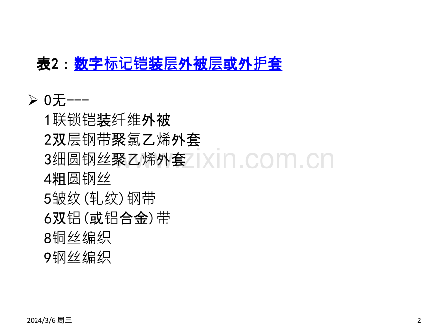 表表1 1:电缆产品型号中各部分代号及其含品型号中各部分代号及其含义符号意义符号意义符号意义A安装线缆X橡胶P屏蔽B布电线VZ阻燃聚氯乙烯R软线K控制B聚丙烯S双绞,射(频)F氟塑料V聚氯乙烯B平行(即扁的)J交联L铝B编织套SB无线电装置用线H橡套D不滴流WDZ无卤低烟阻燃型Y聚乙烯T特种F分相ZR具有阻燃W耐气候耐油2024/3/6 周三1.表表2 2:数字数字标记铠装装层外被外被层或外或外护套套0无-1联锁铠装纤维外被2双层钢带聚氯乙烯外套3细圆钢丝聚乙烯外套4粗圆钢丝5皱纹(轧纹)钢带6双铝(或铝合金)带8铜丝编织9钢丝编织2024/3/6 周三2.注意:电缆的载流量受敷设方式及周围环境影响较大,电缆的电压降受电缆长度的影响较大,所以载流量可以认为是电缆长期运行绝不可能超过的值,最好按电缆载流量的70%80%来选择电缆才能有效的保证线路的温升及电压降。2024/3/6 周三3.电缆载流量口决:估算口诀:二点五下乘以九,往上减一顺号走。三十五乘三点五,双双成组减点五。条件有变加折算,高温九折铜升级。穿管根数二三四,八七六折满载流。2024/3/6 周三4.汇流箱两流箱两侧电缆选型型对照表照表序号汇流箱规格断路器额定电流组件侧电缆规格直流柜侧电缆规格12进1出16APV1-F 1*4mm4或6mm23进1出25APV1-F 1*4mm6mm34进1出32APV1-F 1*4mm10mm45进1出40APV1-F 1*4mm10或16mm56进1出50APV1-F 1*4mm16mm67进1出63APV1-F 1*4mm16mm78进1出64APV1-F 1*4mm25mm89进1出80APV1-F 1*4mm35mm910进1出80APV1-F 1*4mm35或50mm1011进1出100APV1-F 1*4mm50mm1112进1出100APV1-F 1*4mm50mm1213进1出125APV1-F 1*4mm50或70mm1314进1出125APV1-F 1*4mm70mm1415进1出125APV1-F 1*4mm70mm1516进1出160APV1-F 1*4mm70mm1617进1出200APV1-F 1*4mm70mm2024/3/6 周三5.直流柜两直流柜两侧电缆选型型对照表照表序号直流柜规格断路器规格汇流箱侧电缆规格逆变器侧电缆规格备 注12进1出16A4mm4mm23进1出32A6mm6mm34进1出40A10mm10mm45进1出50A16mm16mm56进1出50A16mm16mm67进1出63A16mm16mm78进1出80A25mm25mm89进1出80A35mm35mm910进1出80A50mm50mm1011进1出100A50mm50mm1112进1出100A50mm50mm1213进1出125A70mm70mm1314进1出125A70mm70mm1415进1出125A70mm70mm1516进1出160A70mm70mm1617进1出160A70mm70mm2024/3/6 周三6.逆逆变器两器两侧电缆选型型对照表照表序号逆变器规格逆变器相数直流柜侧电缆规格变压器侧电缆规格备 注15KWp单相2*6mm2*6mm210KWp单相2*10mm2*10mm317KWp三相2*10mm3*10mm420KWp三相2*16mm3*16mm550KWp三相2*70mm3*50mm6100KWp三相2*120mm3*120mm8250KWp三相2*300mm或4*120mm3*300mm9500KWp三相4*300mm或6*185mm6*300mm或9*185mm10630KWp三相6*300mm或8*185mm9*240mm2024/3/6 周三7.变压器两器两侧电缆选型型对照表照表序号变压器规格变压器位置低压侧电缆规格高压器侧电缆规格备 注1500KVAT接终端6*300mm3*25mm2630KVAT接中间端9*300mm3*25mm31000KVAT接中间端12*300mm3*70mm41250KVAT接中间端15*300mm3*95mm2024/3/6 周三8.