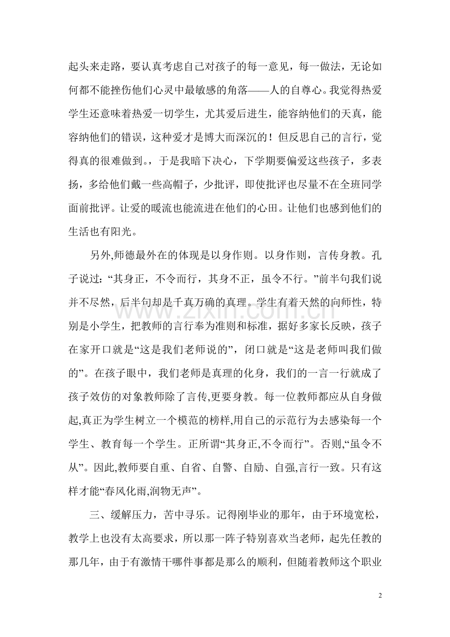 三、缓解压力,苦中寻乐。记得刚毕业的那年,由于环境宽松,教学上也没有太高要求,所以那一阵子特别喜欢当老师,起先任教的那几年,由于有激情干哪件事都是那么的顺利,但随着教师这个职业社会地位的提升,我们日益受到外界的关注,来自家长,来自社会的压力日渐趋增,所以现在当教师感受较多的却是压力,把教学当作是一种幸福、快乐不是一点也没感受到,而是感受颇少!没有时间和精力去感受!其实我们都曾有过幸福的时刻,当教了几年的班级将要不教,孩子们在班会课中流着眼泪与你述说心里话时;当孩子们犯了错误后,手捧鲜花集体向你道歉时;当曾经教过的孩子一起约好到你家里搞聚餐时,我们不也曾感动过,幸福过,快乐过吗?所以我觉得压力既然存在,也无须多加抱怨,苦中寻乐,调整自己的心态,去追求一种教学的新境界。有人说我们是太阳底下最光辉的职业,有人说我们是人类灵魂的工程师,有人说我们是春蚕——春蚕到死丝方尽,有人说我们是蜡烛——燃烧自己,照亮别人。我想我们没有这么伟大,我们不过是铺路人,是桥梁,是灯塔而已!教书育人,不误人子弟;以身作则,维护自己的声誉;关爱学生,感受孩子的一片真情,忙忙碌碌,寻找人生的一种乐趣!我想,我们的生活不过是如此而已!