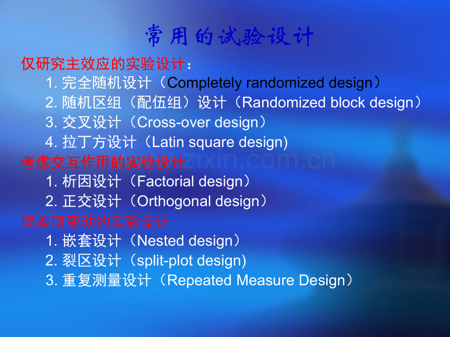 第六章 常用的试验设计及统计分析常用的试验设计仅研究主效应的实验设计:1.完全随机设计(Completelyrandomizeddesign)2.随机区组(配伍组)设计(Randomizedblockdesign)3.交叉设计(Cross-overdesign)4.拉丁方设计(Latinsquaredesign)考虑交互作用的实验设计1.析因设计(Factorialdesign)2.正交设计(Orthogonaldesign)误差项变动的实验设计1.嵌套设计(Nesteddesign)2.裂区设计(split-plotdesign)3.重复测量设计(RepeatedMeasureDesign)第一节 仅研究主效应的实验设计一、完全随机设计:将受试对象随机地分配到各个处理组的设计。随机分组方法:1.编号,确定分组方案2.产生随机数字(随机数字表,或电脑),排序3.按方案分组(如较少10个随机数为A,中间10个数为B,较大10个随机数为C)编号123456789102930随机数12418272729141326524297 8分组BACCCCABCACCAABEBDEACCADEBDCAECBD例:用五种肥料处理棉花,试验重复4次,试验设计见下图,最终棉花产量资料见completerandom.sav。试比较五种处理对棉花产量的影响是否有差异。给出两两比较的p值直接给出分组信息方差齐性检验绘平均值图P0.05,方差齐各处理间差异显著棉花产量肥料5732.2917a肥料41473.9583b肥料31750.0000b肥料21799.4792b肥料11993.7500b各处理间棉花产量差异显著性(S-N-K)处理1和处理4之间棉花产量差异显著(LSD)(F=12.823,d.f.=1,15,p=0.018)或(F1,15=12.823,p=0.018)随机区组设计(randomizedblockdesign),又称配伍组设计。是单因素设计的方差分析,使用的却是多因素方差分析的方法。实验设计中常按影响试验结果的非处理因素(如窝别等)配成区组(block),再将区组内的受试对象随机分配到各组。这种设计方法统计检验效能较高。缺点是比较麻烦。二、随机区组设计 随机分组方法(每个单位组内随机):1.将同窝大白鼠为一个区组(block),并编号;2.给每个大白鼠一个随机数;3.按规定分组:规定随机数小者分到甲组,中等分到乙组,大者分到丙组.4个区组大白鼠按随机区组设计随机区组设计分组区组号1234小白鼠123456789101112随机数683526009953936128527005序号321132321231分配结果丙乙 甲甲丙乙丙乙甲乙丙甲A3F3B3F1C1D1E3D3C3B1E1A1C4F4A4D2B2F2B4D4E4E2C2A2随机区组设计:6种肥料以4种方法处理棉花,试验安排据地形划分4个区,最终棉花产量资料见randomblock.sav。试比较6种处理对棉花产量的影响是否有差异。GLMUnivarivate给出Yield=Intercept+treat+block参数估计值方差齐性检验绘残差图当存在协变量时,按协变量为均数的情况计算固定变量的边际均数。方差齐性检验无法输出。这是因为两个因素的各水平交叉。如果要检查方差齐性,每个单元格内至少要有3个数据点。多因素的方差分析各组变异的齐性检验不是很重要。aaabababbObservedvspredicted线性越强越好残差越分散越好将block作为随机变量(Randomfactor)模型不同(分别做treat和block的模型)结果不变,但随机变量Block不能作两两比较。如果不考虑Block的影响,只作one-wayANOVA呢?为什么one-wayANOVA没有检测到差异显著性呢?三、交叉设计:平行组试验:受试者被随机分到两个研究小组(治疗组A或治疗组B中的一个)中,。然后比较二个组的结果。(t-test,one-wayANOVA)交叉设计:选择受试人群,分配他们到不同治疗组,组A或组B。当两组治疗一段时间后,受试者进入一个清洗期,然后用药反过来。接受B治疗的组将接受A治疗,反之亦然。在这种形式中,每个受试者成为他或她自身的对照。这个方法提供了最好的对照,也就是说每个受试者将会是其自己的对照。例:12种高血压病人采用A、B两种方案治疗,随机让6人先以A法治疗,经过一定清洗期后再以B法治疗;另外6人先以B法治疗,后以A法治疗;记录血压下降值。结果见下表。数据见crossover.sav。试分析两种方案的疗效有无差别。阶段病人编号123456789101112IBBABAAAABBBA3.07 1.33 4.41.87 3.23.73 4.13 1.07 1.07 2.27 3.47 2.4IIAABABBBBAAAB2.81.47 3.73 3.62.67 1.62.67 1.73 1.47 1.87 3.47 1.73由于patient被看作是从一个总体中抽样得到的,所以作为随机变量。WarningsPosthoctestsarenotperformedfor治疗方案becausetherearefewerthanthreegroups.如果对只有两个水平的变量,选择Posthoc,则不会给出结果。主要因素和误差项的平方和和自由度分别给出处理A和处理B之间疗效差异不显著(F=4.599,d.f.=1,10,p=0.058)四、拉丁方设计 拉丁方设计是从横行和直列两个方向进行双重局部控制,使得横行和直列两向皆成区组的设计。在拉丁方设计中,每一行或每一列都成为一个完全区组,而每一处理在每一行或每一列都只出现一次。在拉丁方设计中,试验处理数=横行区组数=直列区组数=试验处理的重复数。一、拉丁方简介(一)拉丁方以n 个拉丁字母A,B,C,为元素,列出一个n阶方阵,若这n个拉丁方字母在这n 阶方阵的每一行、每一列都出现、且只出现一次,则称该n阶方阵为nn阶拉丁方。例如:例如:A B B A B A A B 为为22阶拉丁方,阶拉丁方,22阶拉丁方只有这两个。阶拉丁方只有这两个。A B C B C A C A B 为为33阶拉丁方。阶拉丁方。(二)常用拉丁方最常用的有33,44,55,66阶拉丁方。下面列出部分标准型拉丁方,供进行拉丁方设计时选用。二、拉丁方设计方法二、拉丁方设计方法 下面结合具体例子说明拉丁方设计方法。为了研究5种不同温度对蛋鸡产蛋量的影响,将5栋鸡舍的温度设为A、B、C、D、E,把各栋鸡舍的鸡群的产蛋期分为5期,由于各鸡群和产蛋期的不同对产蛋量有较大的影响,因此采用拉丁方设计,把鸡群和产蛋期作为单位组设置,以便控制这两个方面的系统误差。拉丁方设计步骤如下: