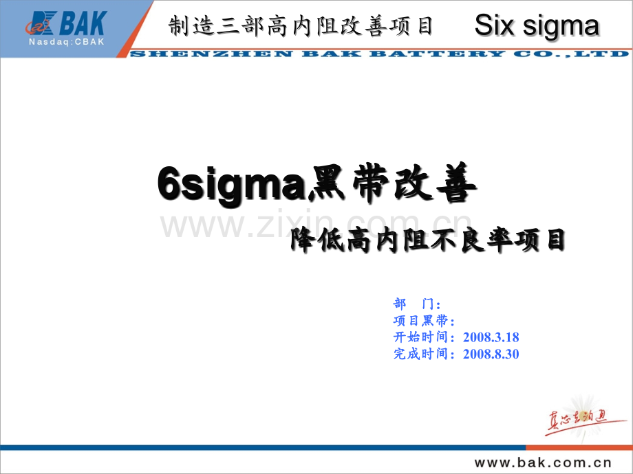 <p>6sigma黑带改善黑带改善 降低高内阻不良率项目降低高内阻不良率项目部部 门:门:项目黑带:项目黑带:开始时间:开始时间:2008.3.18完成时间:完成时间:2008.8.30Six sigma制造三部高内阻改善项目制造三部高内阻改善项目Six sigma团队成员方案规划、协调过程相关事宜,进度跟踪和控制,主导数据收集和原因分析,协调改善方案协调公司资源对本项目予以人员、物质等支持和指导负责方案培训、指导,客户和专业信息收集、分析指导负责滚槽B班人员改善项目措施执行和控制负责滚槽A班人员改善项目措施执行和控制负责项目改善方案、措施的跟进,实验验证制造三部高内阻改善项目制造三部高内阻改善项目负责设备的管理和维护,原因分析和改进项目 Six sigmadataDefineMeasureAnalyzeImproveControl3.18-4.30完成现状分完成现状分析和目标定析和目标定义,完成项义,完成项目财务收益目财务收益估算估算4.30-5.30完成主要完成主要X的的MSA,并找,并找到主要的到主要的X项项目目5.30-6.30确认主要确认主要X6.30-7.30寻找对策控寻找对策控制制X,使,使X得得到有效控制到有效控制7.30-8.30有效改善对策有效改善对策的标准化,进的标准化,进一步控制一步控制X项目进度表制造三部高内阻改善项目制造三部高内阻改善项目Six sigmaDefine 阶段制造三部高内阻改善项目制造三部高内阻改善项目选题理由VOPCTQMSAY现状能力Y分布规律目标设定财务分析Six sigmaD阶段的思路项目选择的理由明确客户需求确定关键CTQY的分布规律预算财务收益制造三部高内阻改善项目制造三部高内阻改善项目MSAY的现状水平Y的目标制订现状分析VOC/VOB调查高内阻不良品的解剖小组讨论关键CTQ确定确定关键CTQ的计算公式图表展示Y现状对Y的现状进行统计确定Y和各小y的目标按目标进行收益评估Six sigmaVOC声音:发给客声音:发给客户高内阻电芯数量户高内阻电芯数量增多且不稳定增多且不稳定High IR Cell quantity in each batch out shipment to SMPPCSBatch制造三部高内阻改善项目制造三部高内阻改善项目选题理由VOPCTQMSAY现状能力Y分布规律目标设定财务分析07年高内阻Y的不良率分布Six sigma制造三部高内阻改善项目制造三部高内阻改善项目汇总汇总07年年10-12月份高内阻电芯占生产电芯不良率为月份高内阻电芯占生产电芯不良率为:13800PPM;而占工序检测次;而占工序检测次品数不良率为品数不良率为:24610PPM;右表为各月份高内阻电芯占批次不良最高比率的两个;右表为各月份高内阻电芯占批次不良最高比率的两个批次。批次。批次批次高内阻最高高内阻最高不良批次不良批次 不良率不良率10月月4VM7 H258.18%11月月4VM7J132.32%4VM7K082.49%12月月4VM8K272.05%4VM8K292.01%选题理由VOCCTQMSAY现状能力Y分布规律目标设定财务分析08年高内阻Y的公布:对比07年无明显下降趋势Six sigma制造三部高内阻改善项目制造三部高内阻改善项目汇总汇总1-4月份高内阻电芯占生产电芯不良率为月份高内阻电芯占生产电芯不良率为:10200PPM;而占工序检测次品;而占工序检测次品数不良率为数不良率为:15830PPM;右表为各月份高内阻电芯占批次不良最高比率的两个;右表为各月份高内阻电芯占批次不良最高比率的两个批次。批次。批次批次高内阻不良高内阻不良率率1月月4VM7L012.04%4VM7 L101.69%2月月4VM7L272.23%4VM7L282.22%3月月4VM8B162.38%4VM8B192.11%4月月4VM8C202.96%4VM8C212.58%选题理由VOCCTQMSAY现状能力Y分布规律目标设定财务分析Six sigma1.提高极耳焊接 合格率。2.提高卷绕焊接 合格率。1.降低高内阻比 率,高内阻不良 品不流出厂。2.降低品质失败 成本。高内阻出货为零内部顾客VOP制程制程QC内部顾客VOB公司领导公司领导外部顾客VOC客户客户VOC&VOB&VOP汇总汇总1、提高制程能力,减少高内阻电芯比率2、降低品质失败成本选题理由VOCCTQMSAY现状能力Y分布规律目标设定制造三部高内阻改善项目制造三部高内阻改善项目Six sigma制造三部高内阻改善项目制造三部高内阻改善项目选题理由VOPCTQMSAY现状能力Y分布规律目标设定财务分析NGOKOKOKOKNG领取高内阻电池放电测量电池内阻值解剖顶盖测量帽盖内阻值判定高内阻原因:帽盖内阻NG测量正极耳与钢壳内阻值检查正极耳状态解剖查看负极点焊情况解剖钢壳测量极组内阻值NG判定高内阻原因:极组内阻NG判定高内阻原因:负极耳虚焊1.判定高内阻原因:正极耳抽出NG2.电芯内部不明断路NG高内阻电池原因分析解剖流程图Six sigma制造三部高内阻改善项目制造三部高内阻改善项目图二:测帽盖内阻图三:测卷芯内阻图四:负极耳虚焊图五:负极耳弯折未焊接图六:负极耳弯折,半个焊点图一:用管钳解剖选题理由VOPCTQMSAY现状能力Y分布规律目标设定财务分析解剖寻找Y的CTQSix sigma制造三部高内阻改善项目制造三部高内阻改善项目解剖507pcs高内阻电芯,进行原因分析,不良原因结果如下:选题理由VOPCTQMSAY现状能力Y分布规律目标设定财务分析Six sigmaO高内阻I Y:负极耳虚焊选题理由VOCCTQMSAY现状能力Y分布规律目标设定制造三部高内阻改善项目制造三部高内阻改善项目滚槽负极点焊f(X)目前Y的CTQSix sigma选题理由VOCCTQMSAY现状能力Y分布规律目标设定制造三部高内阻改善项目制造三部高内阻改善项目量具量具 R&R 方差分量来源 方差分量 贡献率合计量具 R&R 0.02055 0.33 重复性 0.02055 0.33 再现性 0.00000 0.00 测量人员 0.00000 0.00部件间 6.26445 99.67合计变异 6.28500 100.00 研究变异%研究变来源 