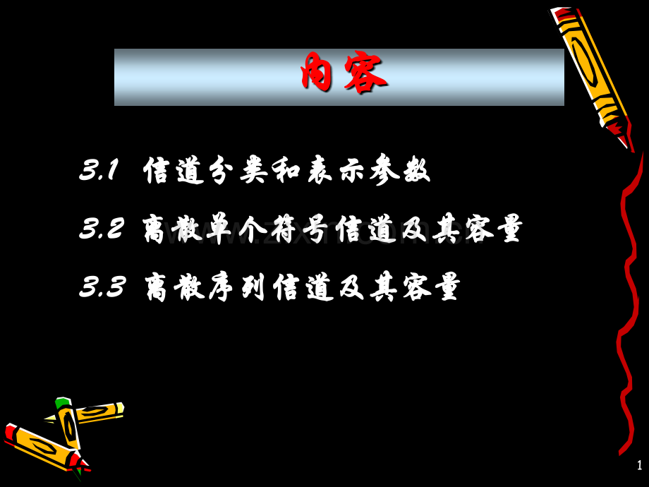 13.1 3.1 信道分类和表示参数信道分类和表示参数3.2 3.2 离散单个符号信道及其容量离散单个符号信道及其容量3.3 3.3 离散序列信道及其容量离散序列信道及其容量内容内容23.1 3.1 信道分类和表示参数信道分类和表示参数3信道信道信道:信息传输的通道 在通信中,信道按其物理组成常被分成微波信道、光纤信道、电缆信道等。信号在这些信道中传输的过程遵循不同的物理规律,通信技术必须研究信号在这些信道中传输时的特性信息论不研究信号在信道中传输的物理过程,并假定信道的传输特性已知,这样信息论就可以抽象地将信道用下图所示的模型来描述。信 道输入量X(随机过程)输出量Y(随机过程)p(Y|X)4(1 1)按其输入)按其输入/输出信号在幅度和时间上的取值输出信号在幅度和时间上的取值是是离散或连续离散或连续来划分来划分 幅度幅度时间时间信道名称信道名称离散离散离散信道(数字信道)连续离散连续信道连续连续模拟信道(波形信道)连续离散半离散半连续信道离散连续3.1.1 3.1.1 信道分类信道分类 5信道分类信道分类(2)按输入/输出之间关系的记忆性记忆性来划分:无记忆信道:信道的输出只与信道该时刻的输入有关,而与其他时刻的输入无关有无记忆信道:信道的输出不但与信道现时的输入有关而且还与以前时刻的输入有关6信道分类信道分类(3)按输入输出信号之间的关系是否是确定关系:无干扰信道:输入/输出符号之间有确定的一一对应关系有干扰信道:输入/输出之间关系是一种统计依存统计依存的关系输入/输出的统计关系:离散无记忆信道:离散无记忆信道:用条件概率矩阵来描述。用条件概率矩阵来描述。离散有记忆信道:离散有记忆信道:可像有记忆信源中那样引入状态的概念。可像有记忆信源中那样引入状态的概念。73.1.2 3.1.2 信道参数信道参数设信道的输入X X=(X1,X2 Xi,),Xi a1 an 输出Y=(Y1,Y2 Yj,),Yj b1 bm信道转移概率矩阵p(Y|X):描述输入/输出的统计依赖关系,反映信道统计关系信 道XYp(Y|X)8无干扰无干扰(无噪声无噪声)信道信道无干扰(无噪声)信道信道的输出信号Y与输入信号X之间有确定的关系Y Y=f(X X),已知X X后就确知Y转移概率:9有干扰无记忆信道有干扰无记忆信道有干扰无记忆信道信道的输出信号Y与输入信号X之间没有确定的关系,但转移概率满足:有干扰无记忆信道可分为(输入输出符号数):二进制离散信道离散无记忆信道离散输入、连续输出信道波形信道10二进制离散信道二进制离散信道二进制对称信道BSC输入符号X取值0,1;输出符号Y取值0,1 很重要的一种特殊信道信道转移概率:p(0|0)=1p p(1|1)=1p p(0|1)=p p(1|0)=p0101pp1-p1-p无错误传输的概率传输发生错误的概率11离散无记忆信道离散无记忆信道DMCDMC信道输入是n元符号 X=a1,a2,an信道输出是m元符号 Y=b1,b2,bm转移矩阵a1a2anb1b2bm:p11p12p21p22pnmpij=p(bj|ai)12P:转移概率矩阵已知X,信道输出Y表现出来的统计特性完全描述了信道的统计特性,其中有些概率是信道干扰引起的错误概率,有些是正确传输的概率转移概率矩阵转移概率矩阵133.2 3.2 离散单个符号信道及其容量14信道的输入、输出都取值于离散符号集,且都用一个随机变信道的输入、输出都取值于离散符号集,且都用一个随机变量来表示的信道。量来表示的信道。设离散单符号信道的输入随机变量为设离散单符号信道的输入随机变量为 ,输出随机变量为输出随机变量为 ,由于信道中存在干扰,由于信道中存在干扰,因此输入符号在传输中将会产生错误,这种信道干扰对传输的因此输入符号在传输中将会产生错误,这种信道干扰对传输的影响可用转移概率影响可用转移概率 来描述:来描述:3.2.1 离散单符号信道的数学模型15为了表述简便,常常写成为了表述简便,常常写成其中其中:信道转移概率实际上是一个转移概率矩阵,称为信道转移概率实际上是一个转移概率矩阵,称为信道矩阵信道矩阵16一般离散单符号信道的概率关系:一般离散单符号信道的概率关系:(1 1)输入输出随机变量的联合概率分布为)输入输出随机变量的联合概率分布为 则有则有 其中其中 是信道转移概率,即输入为是信道转移概率,即输入为 ,通过信道传输输出,通过信道传输输出 的概率,通常称为的概率,通常称为前向概率前向概率。它。它是由于信道噪声引起的,所以通常用它描述信道噪声的特是由于信道噪声引起的,所以通常用它描述信道噪声的特性。而性。而 是已知信道输出符号是已知信道输出符号 ,输入符号为,输入符号为 的概率,的概率,称为称为后向概率后向概率。有时把。有时把 称为输入符号的先验概率。称为输入符号的先验概率。而对应的把而对应的把 称为输入符号的后验概率。称为输入符号的后验概率。17(2 2)由全概率公式,可从先验概率和信道转移)由全概率公式,可从先验概率和信道转移概率求输出符号的概率:概率求输出符号的概率:(3 3)根据贝叶斯公式,可由先验概率和信道的转)根据贝叶斯公式,可由先验概率和信道的转移概率求后向概率:移概率求后向概率:写成向量的形式:写成向量的形式:或记成或记成18 平平均均互互信信息息 是是接接收收到到输输出出符符号号集集 后所获得的关于输入符号集后所获得的关于输入符号集 的信息量。的信息量。信信宿宿所所消消除除的的关关于于信信源源的的不不确确定定性性,也也就就是是获获得得的的关关于于信