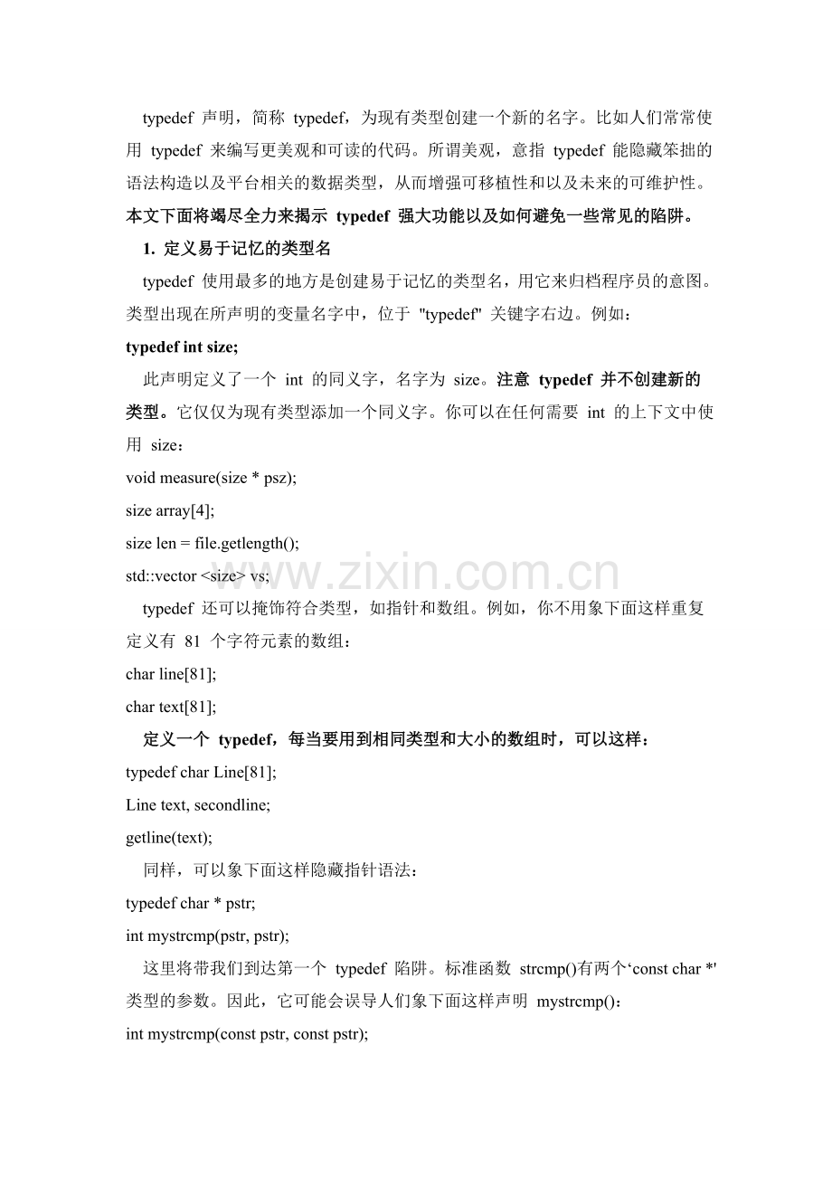 typedef 声明,简称 typedef,为现有类型创建一个新的名字。比如人们常常使用 typedef 来编写更美观和可读的代码。所谓美观,意指 typedef 能隐藏笨拙的语法构造以及平台相关的数据类型,从而增强可移植性和以及未来的可维护性。本文下面将竭尽全力来揭示 typedef 强大功能以及如何避免一些常见的陷阱。