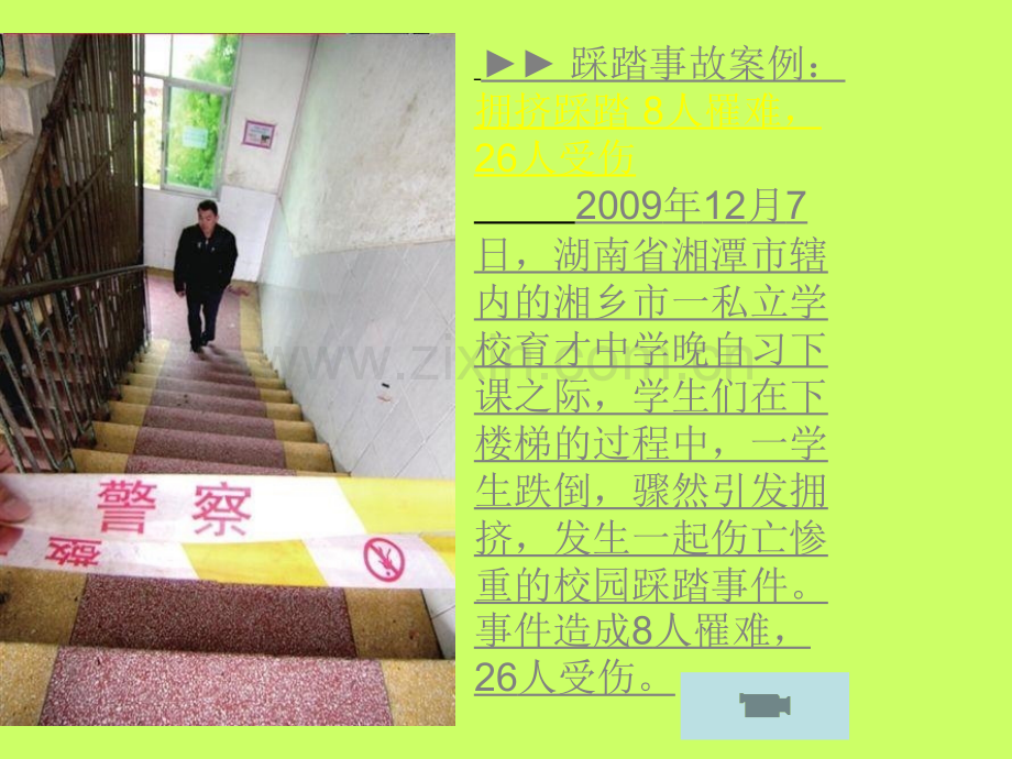 综合实践课课件综合实践课课件 校园安全隐患调查 踩踏事故案例:拥挤踩踏 8人罹难,26人受伤2009年12月7日,湖南省湘潭市辖内的湘乡市一私立学校育才中学晚自习下课之际,学生们在下楼梯的过程中,一学生跌倒,骤然引发拥挤,发生一起伤亡惨重的校园踩踏事件。事件造成8人罹难,26人受伤。溺水事故案例:6名女孩去洗澡,再也没有回来2011年6月11日,湖南嘉禾县钟水乡白石塘村6名女孩在中午12时许,相约到水塘游泳,全部溺水身亡,其中,5名是在校小学生,1名是16岁社会女青年,共涉及到5户村民家庭。交通事故案例:撞车 21人死亡2011年11月16日 9时40分许,甘肃省庆阳市正宁县榆林子镇一大翻斗运煤货车与当地幼儿园接送车迎面相撞,目前已经造成21人死亡,44人受伤多位幼儿园儿童,其中12人重伤,32人轻伤。刚才我们展示了三个案例,请同学们想一想,看了案例后你发现了什么?有什么共同点?上面三个案例都讲述的是:安全事故安全事故 思考 由此可见,安全问题与我们每个同学息息相关,今天我们就以“我与安全同行我与安全同行”为主题进行一次综合实践活动,对我们天天生活的学校进行一次安全考察,好吗?引入主题引入主题(一一)活动准备阶段活动准备阶段、成立调查组根据学生的兴趣、特点及活动需要将学生分成三大组。实地考察组:深入校园各个部位,寻找可能有安全隐患的地点及设施。事故调查组:到学校相关部门调查了解学校里曾发生过的安全事故。安全警示标志搜集组:让学生搜集各种安全警示的标志,了解它们的作用及安置地方。2、组员分工各小组根据本组的活动需要进行分工,细化任务,明确各自的职责。3、制作调查表表:学校安全隐患统计表表:学校安全事故统计表活动过程活动过程表2:学校安全事故统计表 统计时间:年 月 日 事故类型起 数伤亡情况备 注表1:学校安全隐患统计表 统计时间:年 月 日 隐患位置隐患类型隐患描述备 注(二)活动实施阶段(二)活动实施阶段分组调查。实地考察利用课间巡视校园各个部位和角落,仔细寻找藏有安全隐患的地方,了解可能会发生什么事故。如:下雨天,特别滑的路段;在没有老师看管的情况下使用大型活动器材,会产生危险;暴露在外面的电源插座或电线;即将倒塌的墙壁填写学校安全隐患统计表。事故调查向学校政教处调查了解过去一年在校园内发生的安全事故,认真填写学校安全事故统计表。安全警示标志搜集学生可以到校园四周观察、通过上网搜集、查阅书籍、实地观察,搜集一些安全警示标志,可以用照片、图片等形式记录下来,并写出它们的名称、作用以及的安置的地方。通过前阶段对学校安全事故和安全隐患的调查,同学们一定收获不小。下面请各小组以自己喜欢的形式向全班同学展示自己的研究成果。请实地考察组推选一名同学,汇报在校园内发现的具有安全隐患的地方,以及可能会发生的安全事故。请事故调查组推选一名同学汇报近年来发生的安全事故的大致情况。安全警示标志搜集小组展示收集到的安全标志。我我与与安安全全同同行行同学们分工合作,通过采访调查,发现了许多具有安全隐患的地方。那么,我们可以采用哪些有效的方式,提醒自己和全校同学引起注意,从而避免或减少校园安全事故的发生呢?讨论设置安全警示标志、“国旗下讲话”说安全、开个安全小故事会、写安全主题倡议书、张贴受伤同学照片、晨会课学安全规则、开展主题班队活动、评比安全先进班级、出安全主题黑板报、广播安全知识、开展安全主题班会、进行安全知识竞赛、设置校园安全网页、举办安全知识讲座、安全技能培训班、成立校园安全巡警队同学们的金点子真不少。请大家为我们本次开展的“我与安全同行”这一综合实践活动提一个口号:。“心系安全,关爱生命心系安全,关爱生命”通过本节课的学习后可以看出同学们个个都善于观察事物和思考问题,同时也学到了不少的安全方面的知识。下一堂综合实践活动课,我们将继续研究“我与安全同行”的相关问题。心系安全,关爱生命心系安全,关爱生命