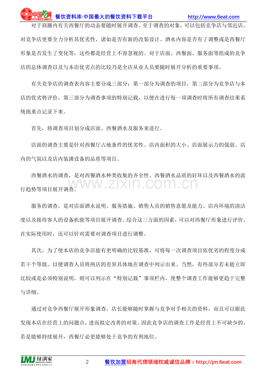对于商圈内有关西餐厅的动态要随时展开调查。至于调查的对象,可以包括竞争店与邻近店。对竞争店更要全力分析其优劣性,诸如是否有新的改装设计、酒水内容是否有了调整或是西餐厅形象是否发生了变化等,这些都是经营上不容忽视的。对于店面、西餐面、服务面等组成的竞争店的总体调查以及与本店优劣点的比较乃是全店从业人员要随时展开分析的重要事项。