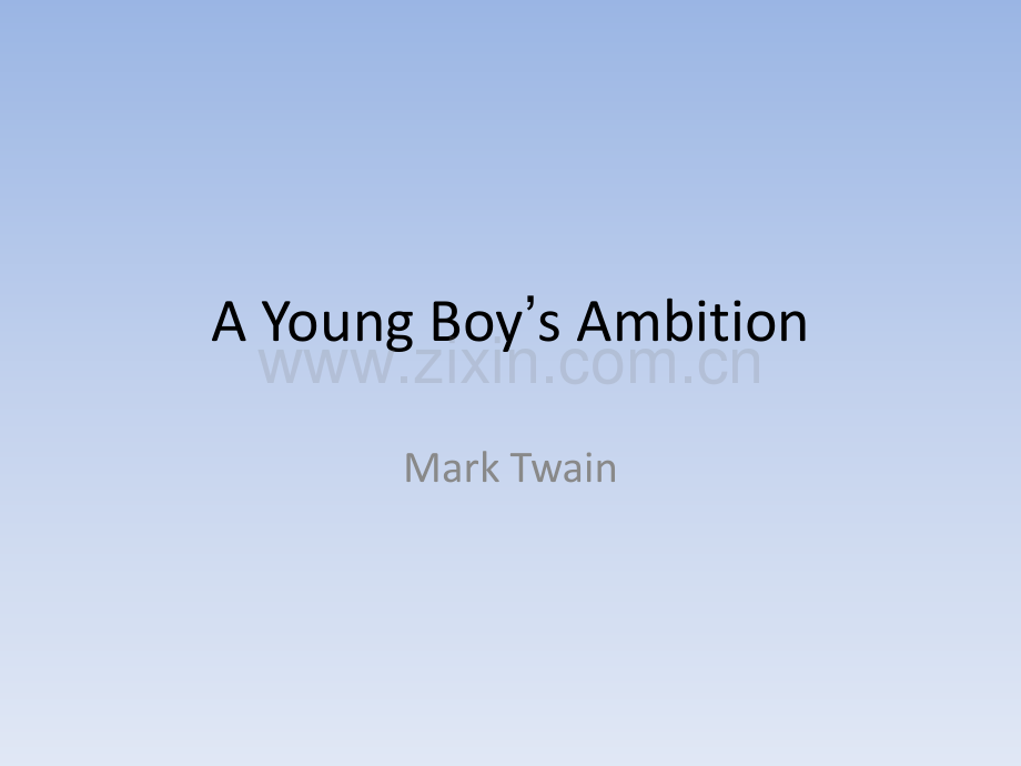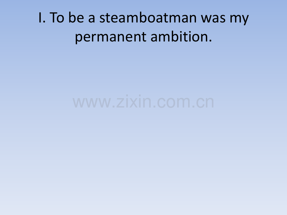 A Young Boys AmbitionMark TwainI.To be a steamboatman was my permanent ambition.II.The arrival of a steamboat was a very important thing in our life.III.It describes the steamboat,its arrival and departure in detail.IV.It tells us about a boy who became an apprentice engineer on a steamboat.V.Many young men in the town managed to get on the river.VI.It tells about my yearnings and unsuccessful attempts to become a pilot.Then such a scramble as there is to get abroad,and to get ashore,and to take in freight and to discharge freight,all at one and the same time;and such a yelling and cursing as the mates facilitate it all with!Then comes a scramble as there used to be to get into the steamboat,to get off the steamboat,to load the goods and to unload the goods;and the mates tried to make these activities go smoothly with yelling and cursing.This was distinction enough for me as a general thing;but the desire to be a steamboatman kept intruding.Generally speaking,my fathers occupation made me distinctive in the village and I was content with it.However,I was constantly struck by the desire to be a steamboatman.This thing shook the bottom out of all my Sunday-school teachings.This thing made me disbelieve the religious teachings I received in Sundays school.Lapse into:sink into by degreesThe hysterical patient lapsed in silence after he was given an injection of tranquilizer.These young boys lapsed into bad habits of smoking and gambling after they dropped out of school.It seemed to us that the partiality of Providence for an undeserving reptile had reached a point where it was open to criticism.It seemed to us that God should be criticized for being partial to this bad boy and the boy didnt deserve the favor from God.The pilot,even in those days of trivial wages,had a princely salaryfrom a hundred and fifty to two hundred and fifty dollars a month,and no board to pay.In those days when people had small wages,the pilot could get a handsome salary ranging from 150 to 250 dollars a month and he also enjoyed the free meals on board.But only got a cold shoulder and short words from mates and clerks.I was treated with great indifference and with rude and angry words.Make the best of:use sth.as profitably as possibleShe has certainly made the best use of her opportunities to practise her English.Solar power can be made the best of because it is a kind of clean energy.1.His dream of becoming a football star faded out as time went by.2.A Boeing 747 aircraft didnt gain enough height to clear the mountain.In a twinkling,it crashed into the mountain and blew up.No one survived the accident.3.Students have easy access to the resources in the library,so they are supposed to make the best of it.4.Titanic,the most luxurious ship in the world at that time,hit an iceberg when she was under way to the US.Consequently,the ship sank into the Atlantic Ocean and thousands of People died in this shipwreck.5.Every summer,all the tourists pour into this famous beach.They lie packed like sardines on the beach to enjoy the sunbathing.6.They have been to St.Louis once and have a vague general knowledge of its wonders,but the day of their glory is over now.They lapse into a humble silence and learn to disappear when the ruthless engineer approaches.