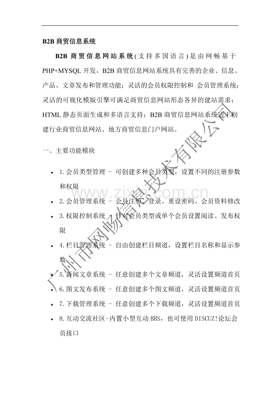 B2B商贸信息网站系统(支持多国语言)是由网畅基于PHP+MYSQL开发,B2B商贸信息网站系统具有完善的企业、信息、产品、文章发布和管理功能;灵活的会员权限控制和 会员管理系统;灵活的可视化模版引擎可满足商贸信息网站形态各异的建站需求;HTML静态页面生成和多语言支持;B2B商贸信息网站系统适于创建行业商贸信息网站、地方商贸信息门户网站。