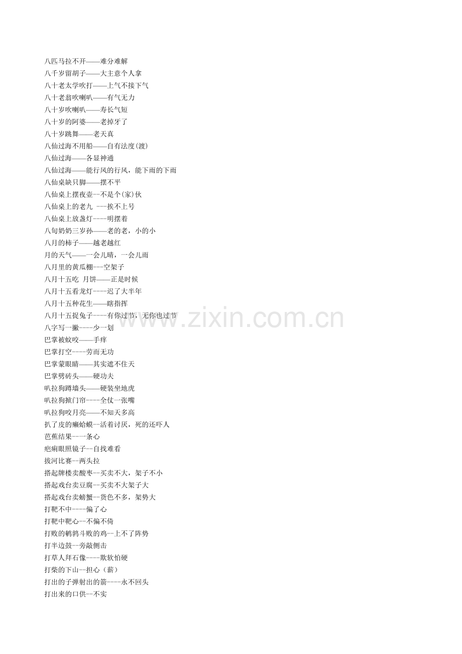 八个麻雀抬轿--担当不起 八个钱算命——哪能包你一世 八虎闯幽州——死的死,丢的丢 八里庄的萝卜--—心里美 八亩地里一棵谷- 就这一个 八匹马拉不开——难分难解 八千岁留胡子——大主意个人拿 八十老太学吹打——上气不接下气 八十老翁吹喇叭——有气无力 八十岁吹喇叭——寿长气短 八十岁的阿婆——老掉牙了 八十岁跳舞——老天真 八仙过海不用船——自有法度(渡) 八仙过海——各显神通 八仙过海——能行风的行风,能下雨的下雨 八仙桌缺只脚——摆不平 八仙桌上摆夜壶--不是个(家)伙 八仙桌上的老九 ---挨不上号 八仙桌上放盏灯----明摆着 八旬奶奶三岁孙——老的老,小的小 八月的柿子——越老越红 月的天气——一会儿晴,一会儿雨 八月里的黄瓜棚---空架子 八月十五吃 月饼——正是时候 八月十五看龙灯----迟了大半年 八月十五种花生——瞎指挥 八月十五捉兔子----有你过节,无你也过节 八字写一撇----少一划 巴掌被蚊咬——手痒 巴掌打空----劳而无功 巴掌蒙眼睛——其实遮不住天 巴掌劈砖头——硬功夫 叭拉狗蹲墙头——硬装坐地虎 叭拉狗掀门帘----全仗一张嘴 叭拉狗咬月亮——不知天多高 扒了皮的癞蛤蟆--活着讨厌,死的还吓人 芭蕉结果--一条心 疤痢眼照镜子--自找难看 拔河比赛--两头拉