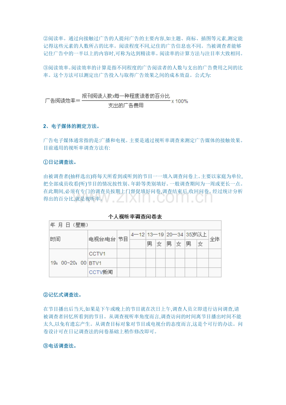 广告电子媒体通常指的是:广播和电视。主要是通过视听率调查来测定广告媒体的接触效果。目前通用的视听率调查方法有: