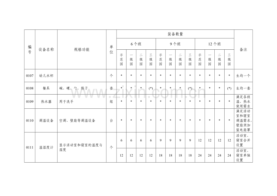 注:幼儿园保教设备分为必配和选配,其中“数字”表示必配(例如:6表示必配,数量为6);“(数字)”表示选配(例如:(6)表示选配,数量为6);装备数量为“*”,表示按“备注”要求装备。
