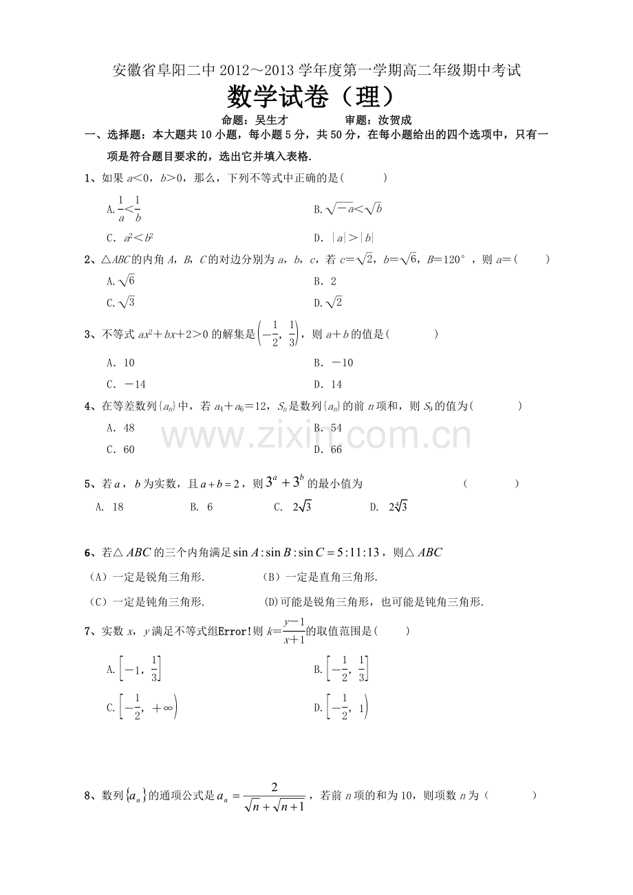 安徽省阜阳二中2012~2013学年度第一学期高二年级期中考试