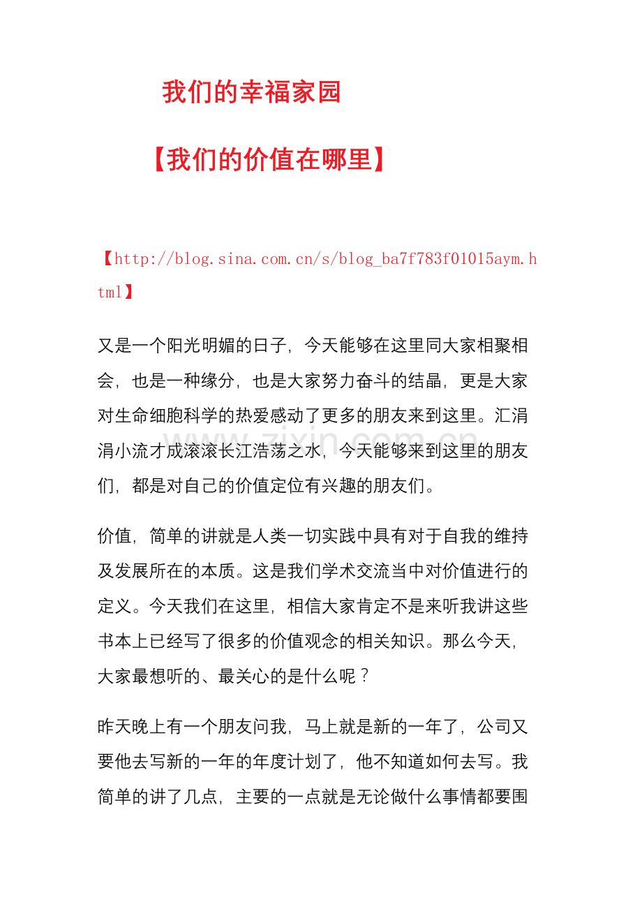 今天,想来想去,我们最关心的就是自己的成长问题,很多人从记忆起,就在不断的探索思考人生的种种问题。从那个时间起,就有很多的人不断的反复问自己、问家人、问朋友,问一些让人一直觉得头大的问题:我是谁?我从哪里来?我要到哪里去?我这一辈子到底要做点什么才有意义?等等一系列的问题。今天我们在这里来探讨的就是我们的价值在哪里?