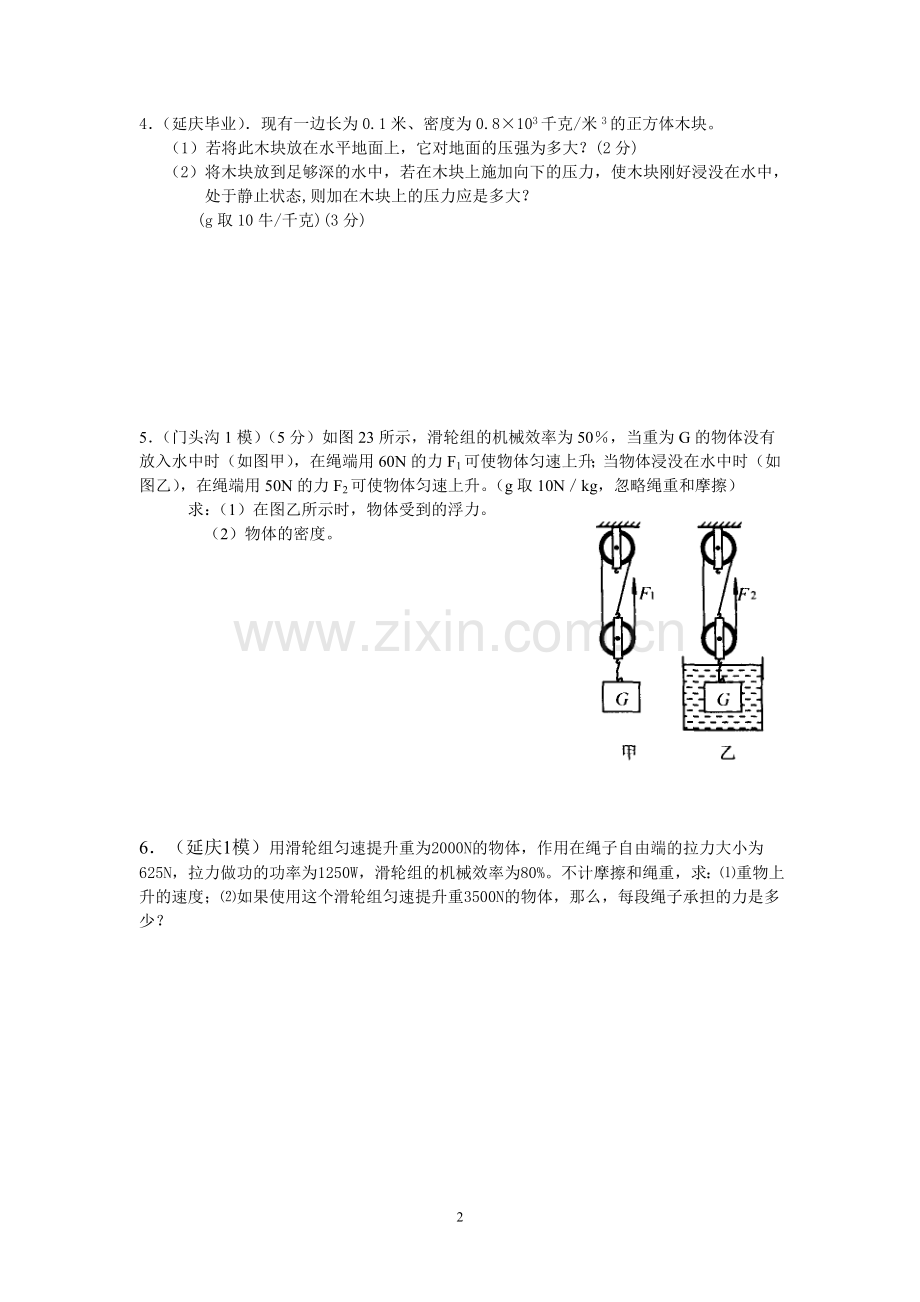 5.(门头沟1模)(5分)如图23所示,滑轮组的机械效率为50%,当重为G的物体没有放入水中时(如图甲),在绳端用60N的力F1可使物体匀速上升;当物体浸没在水中时(如图乙),在绳端用50N的力F2可使物体匀速上升。(g取10N/kg,忽略绳重和摩擦)