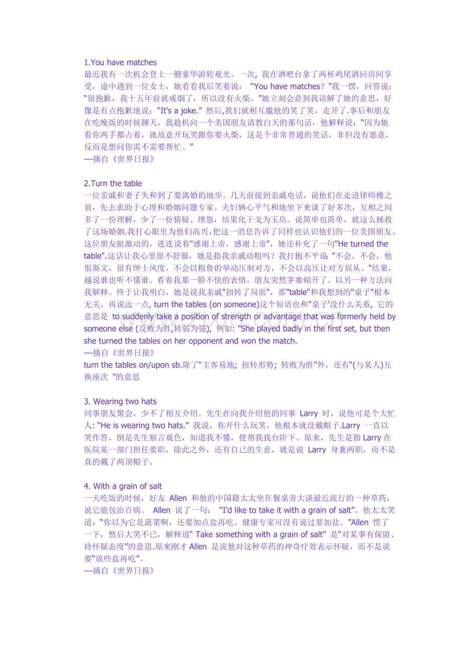 最近我有一次机会登上一艘豪华游轮观光。一次, 我在酒吧台拿了两杯鸡尾酒回房间享受,途中遇到一位女士,她看看我后笑着说: “You have matches?”我一愣,回答说:“很抱歉,我十五年前就戒烟了,所以没有火柴。”她立刻会意到我误解了她的意思,好像是有点抱歉地说:“It's a joke.” 然后,我们就相互尴尬的笑了笑,走开了.事后和朋友在吃晚饭的时候聊天,我趁机向一个美国朋友请教白天的那句话,他解释说:“因为她看你两手都占着,就故意开玩笑跟你要火柴,这是个非常普通的笑话,非但没有恶意,反而是想问你需不需要帮忙。”