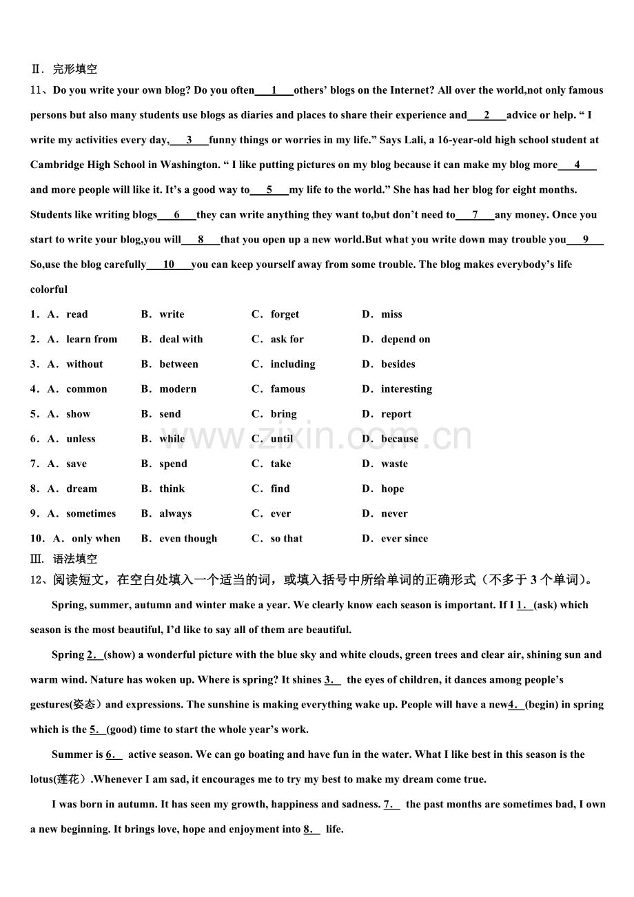 11、Do you write your own blog? Do you often 1 others’ blogs on the Internet? All over the world,not only famous persons but also many students use blogs as diaries and places to share their experience and 2 advice or help. “ I write my activities every day, 3 funny things or worries in my life.” Says Lali, a 16-year-old high school student at Cambridge High School in Washington. “ I like putting pictures on my blog because it can make my blog more 4 and more people will like it. It’s a good way to 5 my life to the world.” She has had her blog for eight months. Students like writing blogs 6 they can write anything they want to,but don’t need to 7 any money. Once you start to write your blog,you will 8 that you open up a new world.But what you write down may trouble you 9 So,use the blog carefully 10 you can keep yourself away from some trouble. The blog makes everybody’s life colorful