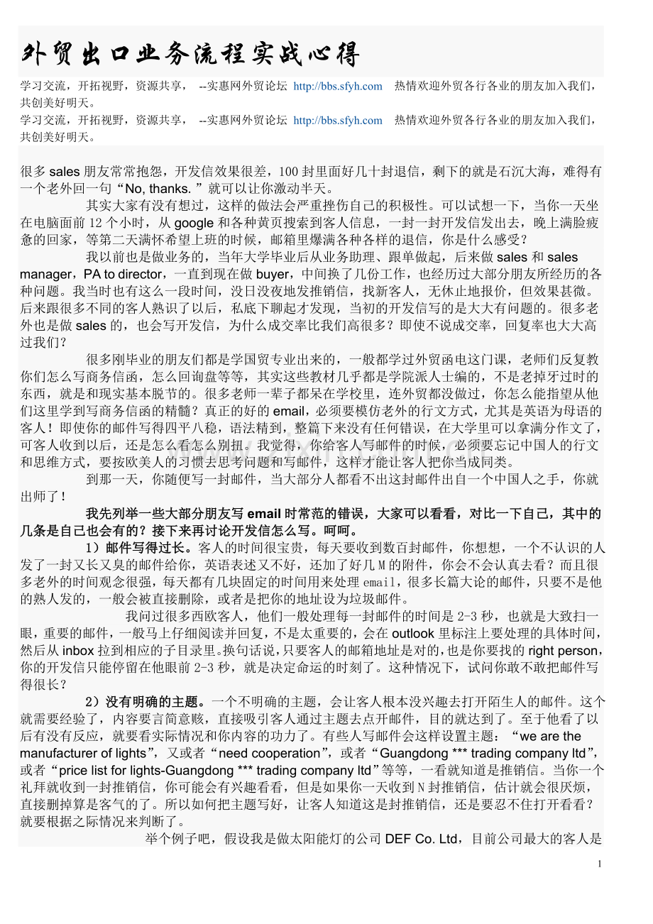 呵呵,其实外贸函电里还是有很多精华的东西的,比如“3C原则”,比如多用被动语态,比如很多专业的词汇和短语。