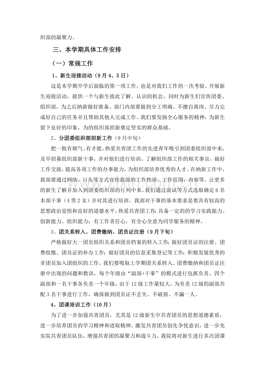 4、 加强与团支书之间的交流,组织部成员尤其是负责各团支部的干事要经常性与团支书进行沟通,以发现我们工作中的不足,并及时改正;善于听取团支书的建议和意见,鼓励各团支书大胆的尝试和创新。