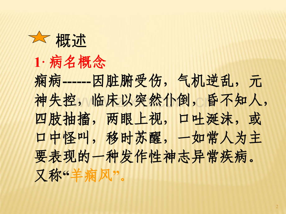 痫 病11 病名概念病名概念痫病痫病-因脏腑受伤,气机逆乱,元因脏腑受伤,气机逆乱,元神失控,临床以突然仆倒,昏不知人,神失控,临床以突然仆倒,昏不知人,四肢抽搐,两眼上视,口吐涎沫,或四肢抽搐,两眼上视,口吐涎沫,或口中怪叫,移时苏醒,一如常人为主口中怪叫,移时苏醒,一如常人为主要表现的一种发作性神志异常疾病。要表现的一种发作性神志异常疾病。又称又称“羊痫风羊痫风”。概述2 素问奇病论“病名为胎病,此得之在母腹中时,其母有所大惊,气上而不下,精气并居,故令子发为巅疾也。”2 源流3 古今医鉴五痫“发则卒然倒仆,口眼相引,手足搐搦,背脊强直,口吐涎沫,声类畜叫,食顷乃苏。”4丹溪 心法“无非痰涎雍塞,迷闷孔窍。”景岳全书“治此者,当察痰察气,因其甚者而先之。”5 西医的癫痫病病 3 范围:原发性癫痫 继发性癫痫 6 证侯特征证侯特征 重症重症:昏仆,抽,叫,涎。突然仆倒,不醒人事。两突然仆倒,不醒人事。两 目上视,口吐涎沫,四肢目上视,口吐涎沫,四肢 抽搐,项背强直,甚则二抽搐,项背强直,甚则二 便失禁,或口作猪羊叫声便失禁,或口作猪羊叫声 ,移时苏醒。,移时苏醒。a:7(1 1)头突然向前倾下,迅速抬起;)头突然向前倾下,迅速抬起;(2 2)两目上吊数秒钟或几分钟即)两目上吊数秒钟或几分钟即 可恢复;可恢复;(3 3)动作突然中断,手中物件落地)动作突然中断,手中物件落地(4)对上述症状发作后全然不知。)对上述症状发作后全然不知。轻症:轻症:神呆,点头,吊目,短暂失忆。8 病因病机情志失调情志失调心肝气郁心肝气郁 痰聚气逆痰聚气逆病发病发 禀赋不足禀赋不足脏气失调脏气失调 风痰闭窍风痰闭窍痫病痫病 饮食不节饮食不节脾失健运脾失健运 痰散气顺痰散气顺休止休止头外伤、产伤头外伤、产伤脑络瘀阻脑络瘀阻痰瘀闭窍痰瘀闭窍痫病痫病 a:痰痰9病机:病机:痰浊、肝风(火)、血瘀。痰浊、肝风(火)、血瘀。病位:病位:脑脑、心、肝、脾、肾。、心、肝、脾、肾。10诊断要点诊断要点先先-先兆期先兆期急急-发作期发作期已已-恢复期恢复期111 发病过程:(临床表现)先-先兆期:短暂的头晕,胸闷,幻觉。12 *重症(大发作)昏仆,抽,叫,涎。*轻症(小发作)神呆,点头,吊目,短暂失忆。急-发作期:13已-恢复期:发作过后,常遗有头昏,发作过后,常遗有头昏,精神疲倦,四肢乏力等精神疲倦,四肢乏力等 症状。症状。142 青少年发病者,多有家族史。青少年发病者,多有家族史。3 发病前多有诱因:惊恐、劳累,发病前多有诱因:惊恐、劳累,饮食不节。饮食不节。4 脑电图检查脑电图检查 棘波,尖波,棘波,尖波,棘慢波。棘慢波。15颅脑颅脑CT,M R检查可发现病灶。检查可发现病灶。16 鉴别要点:17辨证论治辨证论治一、一、辨证要点:辨证要点:1、辨轻重辨轻重 *临床表现分轻证重证。临床表现分轻证重证。*发作程度有轻重之分:发作程度有轻重之分:发作持续时间的长短;发作持续时间的长短;发作间隔时间之久暂。发作间隔时间之久暂。18发作期发作期-多实证或实中夹虚多实证或实中夹虚 阳痫发作多实阳痫发作多实 阴痫发作多虚阴痫发作多虚 2 辨虚实19 休止期休止期-多虚或虚中夹实多虚或虚中夹实 从证型来辨:从证型来辨:风痰闭阻、痰火扰神风痰闭阻、痰火扰神 属属 实证实证 心脾两虚、肝肾阴虚心脾两虚、肝肾阴虚 属属 虚证虚证20二、治疗原则 发作期发作期治标:治标:豁痰熄风,开窍定痫。豁痰熄风,开窍定痫。缓解期缓解期治本:治本:健脾化痰,养心安神,健脾化痰,养心安神,补益肝肾,活血化瘀补益肝肾,活血化瘀。21现代中医急救方法:*平卧头偏向一侧,利于痰涎吐出,平卧头偏向一侧,利于痰涎吐出,使呼吸道通畅。使呼吸道通畅。*抽搐牙关紧闭者,用开口器,抽搐牙关紧闭者,用开口器,避免咬伤舌头;取下义齿。避免咬伤舌头;取下义齿。*针刺人中、合谷、内关。针刺人中、合谷、内关。*通关散搐鼻。通关散搐鼻。22发作期发作期 1、阳痫阳痫主症主症:神昏、抽、叫、涎:神昏、抽、叫、涎 +面色潮红或青紫,舌红,面色潮红或青紫,舌红,苔黄腻,脉弦数或弦滑。苔黄腻,脉弦数或弦滑。次症:心烦失眠,口苦咽干便秘。次症:心烦失眠,口苦咽干便秘。三、分证论治23治法:治法:开窍醒神,泻热涤痰熄风。开窍醒神,泻热涤痰熄风。方药方药:黄连解毒汤合定痫丸:黄连解毒汤合定痫丸医学心悟 (川贝、胆星、法夏、天麻)急救:针刺人中、十宣、合谷。急救:针刺人中、十宣、合谷。静滴清开灵、醒脑静静滴清开灵、醒脑静 灌服安宫牛黄丸242、阴阴痫主症主症:神昏或昏:神昏或昏愦,抽、叫、涎,抽、叫、涎 +面色悔暗,肢冷,舌淡,面色悔暗,肢冷,舌淡,苔白苔白腻,脉沉,脉沉细或沉或沉迟。次症:呆木无知,不次症:呆木无知,不动 不不语,神疲肢倦,神疲肢倦 痰多痰多纳呆便溏。呆便溏。25治法治法:开窍醒神,温化痰涎。:开窍醒神,温化痰涎。方药方药:五生饮,二陈汤。:五生饮,二陈汤。(生南星、生白附子、生半夏、川乌、黑豆)病重者静滴参附注射液,病重者静滴参附注射液,喉中痰鸣者灌服鲜竹沥水。喉中痰鸣者灌服鲜竹沥水。261、脾虚痰盛主症主症:反复发痫不愈,神疲乏力,:反复发痫不愈,神疲乏力,面色恍白,胸闷,痰多,纳面色恍白,胸闷,痰多,纳 呆,便溏,舌淡,苔白腻,呆,便溏,舌淡,苔白腻,脉濡滑。脉濡滑。治法治法:健脾化痰:健脾化痰方药方药:六君子汤