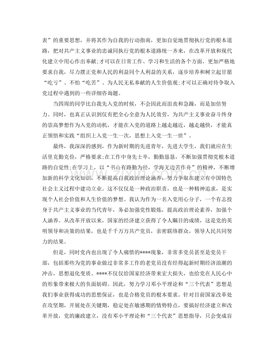 但是,同时党内也出现了令人痛惜的****现象,非常多党员甚至是党员干部,包括那些为党的事业做过非常多工作的老党员没有经得起新时期经济浪潮的冲击,思想退化变质。****不仅仅给国家经济带来宏大损失,也给党在人民心中的形象带来极大的负面妨碍。因此,努力学习邓小平理论和“三个代表”思想是我们事业获得成功的思想保证,也是合格党员的根本要求。针对目前国家改革处在攻坚期,开展处在关键期,稳定处在敏感期的情势特点,要搞好经济建立和改革开放,党的廉政建立,没有邓小平理论和“三个代表”思想指导,只会变成盲目的实践,甚至危急到党在人民群众的地位,我们需要理论的指导,尤其是邓小平理论和“三个代表”思想。同时,我觉得作为一名入党用心分子,就应按照“三个代表”的要求为人处事。确实是要做有梦想、有道德、有文化、有纪律的“四有新人”,在社会主义“两个礼貌”建立中建功立业。做一个有抱负有大志,踏实苦干、乐于奉献的跨世纪新人;做一个不计名利和得失,不被灯红酒绿所迷惑的坚强革命战士;做一个有道德良知、遵纪守法的现代公民。