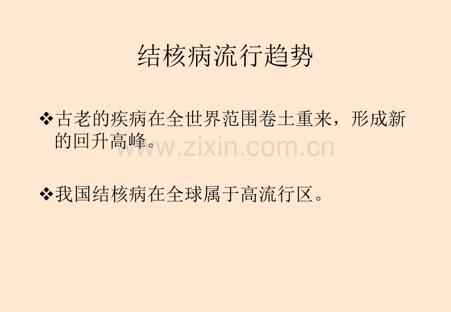 儿儿 童童 结结 核核 病病Tuberculosis in Children结核病流行趋势v古老的疾病在全世界范围卷土重来,形成新的回升高峰。v我国结核病在全球属于高流行区。我国第四次结核病流调结果显示(2000年):v高感染率v高患病率v高死亡率v高耐药率 v农村疫情高于城市v低递降率总总 论论病因和发病机理一、病原体v属分支杆菌,具抗酸性。v耐寒、耐干燥,对紫外线、高热、各种消毒剂敏感。v需氧菌,最好生长环境pH7.4,氧分压13.318.7Kpa(100140mmHg)。v菌型:人型、牛型、鼠型、鸟型根据其生长代谢状况分群:vA群:代谢旺盛、大量增殖的细菌。vB群;缓慢生长细菌,有短期代谢活动。vC群;低代谢状态或接近休眠状态细菌。vD群:代谢静止的休眠菌。二、传染源 痰中带菌的成人肺结核病人,尤其是家庭中排菌的肺结核病人是儿童结核病的传染源。三、传播途径v呼吸道传染 气溶胶状态 菌尘气溶胶状态v消化道传染v其他传染途径 皮肤、胎盘四、机体的反应性致病因素细菌的毒力、数量、菌群 变态反应机体的反应性 免疫反应变态反应机体初次接触结核杆菌淋巴细胞被致敏、大量增生48周迟发型变态反应、病理改变产生原发病灶渗出性炎症病灶周围干酪、坏死全身中毒症状免疫反应淋巴细胞初次接触结核菌T淋巴细胞致敏、产生受体T淋巴细胞再次接触致病原致敏淋巴细胞产生多种淋巴因子巨噬细胞移动抑制因子巨噬细胞活化因子趋化因子使病变局限吞噬、杀灭细菌变态反应与免疫反应关系v发生机理相同,是同一细胞免疫过程中的两种不同表现。v双刃剑:免疫反应变态反应,机体抵抗力最强;免疫反应变态反应,炎症反应剧烈,造成组织严重损伤或结核菌播散,对机体不利结核病的诊断诊断要点:1.结核病接触史2.近期急性传染病史3.卡介苗接种史4.临床表现5.结核菌素试验6.线检查7.实验室检查8.活体组织检查临床表现:v结核中毒症状 发热、盗汗、精神不振、食欲减退、消瘦、疲乏无力v呼吸系统症状 轻咳,一般呼吸道症状和体征不多v结核过敏现象 疱疹性结膜炎、结节性红斑、一过性多发性关节炎v浅表淋巴结肿大诊断要点:1.结核病接触史2.近期急性传染病史3.卡介苗接种史4.临床表现5.结核菌素试验6.线检查7.实验室检查8.活体组织检查实验室检查:v血沉v病原学检查 涂片、培养v免疫学诊断及分子生物学 DNA探针、PCR诊断要点:1.结核病接触史2.近期急性传染病史3.卡介苗接种史4.临床表现5.结核菌素试验6.线检查7.实验室检查8.活体组织检查结核病分类(2001年 中华结核和呼吸杂志)型 原发型肺结核型 血源播散性肺结核型 继发型肺结核 分别以 增殖病变、浸润病变、干酪病变、空洞病变为主型 结核性胸膜炎型 肺外结核结 核 病 预 防目的:1.预防儿童感染结核菌 2.预防感染儿童发展成严重结核病一、卡介苗接种v原理 以人工的方法将减毒或灭毒的牛型结核杆菌株制成的卡介苗接种于人体,产生轻度的肺外原发感染,使机体形成对结核菌特异免疫力。v接种对象 新生儿是主要接种对象;最迟在一岁内完成接种。二、药物预防v预防对象预防对象:1.密切接触开放性结核病人的婴幼儿。2.未接种卡介苗而结核菌素试验阳性的婴幼儿。3.结核菌素试验新近由阴转阳的儿童。4.结核菌素试验(),胸片检查阴性但有结核中毒症状者(结核感染)。5.新患急性传染病、结核菌素试验阳性者。6.长期使用激素治疗、结核菌素试验阳性者。v 方法方法:INH 10 d,疗程为69月。三、隔离传染源v早期发现患有活动性肺结核病人,及时给予隔离和治疗。v杜绝其他传染源。治治 疗疗一、全身疗法v合理的营养和休息v适当的室内外活动v避免继发感染、反复感染二、化学疗法抗结核药物分类:1.用药后血浓度与该药最小抑菌浓度的比值;2.野生分支杆菌群中耐药菌率;3.药物的治疗剂量与产生毒性反应剂量的比值;4.病人对药物的耐受程度。甲类:INH、RFP乙类:SM、PZA、EM、KM、CS、VM、CM丙类:PAS、TB1异烟肼(INH)v血浓度高v渗透能力强v进入细胞膜的能力强v口服吸收快而完全v峰浓度治疗效果好v单独使用可产生耐药性v副作用:精神兴奋症状、周围神经炎、皮疹、肝损害v剂量:1020/d 2030/d(重症)400/d利福平(RFP)v杀菌作用发生快v杀菌作用强而全面v组织渗透性好v口服吸收分布良好v单独使用可产生耐药性v副作用:肝损害、血液系统改变,体液黄变。v剂量:1015/d 450/d链霉素(SM)v对生长代谢旺盛的细菌杀菌作用显著v不易穿过细胞膜v不易透过血脑屏障v单独使用容易产生耐药性v副作用:第八对颅神经损害、可逆性肾功能障碍。v剂量:2030/d 0.75/d吡嗪酰胺(PZA)v在酸性环境下有强杀菌作用v对持存菌有特殊作用v易通透血脑屏障v口服吸收良好,分布广泛 v副作用:肝损害、关节痛、高尿酸血症v剂量:2030/d 0.75/d乙胺丁醇(EMB)v抑菌药v与其他药物联用可延缓耐药菌株的出现v可渗透到结脑病人的脑脊液中v副作用:球后视神经炎、视力障碍、对红绿色分辨能力下降v剂量:1525/d 0.75/d抗结核药物的化疗原则v早期治疗v适宜剂量v联合用药v规律用药v坚持全程v分段治疗三、激素治疗v使用原则:使用激素必须同时使用有效的抗结核药物保护。v使用指征:1.急性渗出性胸膜炎、腹膜炎、心包炎2.肺部有广泛渗出性病变3.严重结核病变v用法:泼尼松 12/d(45/d)4周,渐减量48周后停用。