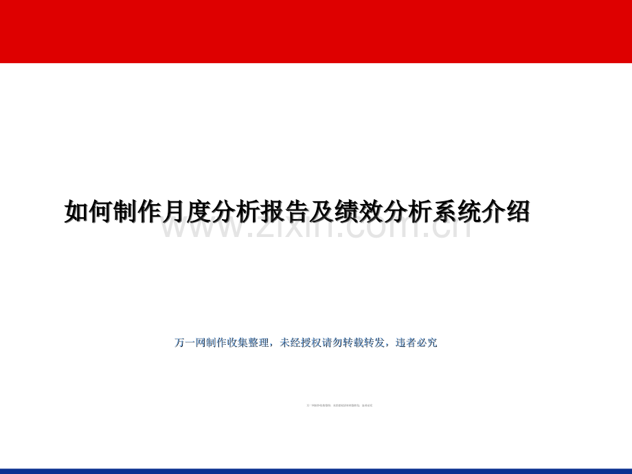 如何制作月度分析报告及绩效分析系统介绍如何制作月度分析报告及绩效分析系统介绍如何制作月度分析报告及绩效分析系统介绍如何制作月度分析报告及绩效分析系统介绍万一网制作收集整理,未经授权请勿转载转发,违者必究万一网制作收集整理,未经授权请勿转载转发,违者必究万一网制作收集整理,未经授权请勿转载转发,违者必究万一网制作收集整理,未经授权请勿转载转发,违者必究目录目录制作分析报告的目的和意义制作分析报告的目的和意义1基础数据的收集准备基础数据的收集准备2分析方法的选择分析方法的选择3分析逻辑框架和分析指标分析逻辑框架和分析指标4绩效分析系统介绍绩效分析系统介绍5制作分析报告的目的与意义制作分析报告的目的与意义了解现有营销队伍状况,对现有队伍有清晰认识了解现有营销队伍状况,对现有队伍有清晰认识整合和沉淀分散数据,为以后数据分析提供比较依据整合和沉淀分散数据,为以后数据分析提供比较依据提供给管理层决策依据,使决策得到数据支撑提供给管理层决策依据,使决策得到数据支撑目的与意义目的与意义目的与意义目的与意义通过数据分析发现队伍规律和趋势,提高管理水平通过数据分析发现队伍规律和趋势,提高管理水平体现营销员管理岗位管理价值的平台,展现工作成果体现营销员管理岗位管理价值的平台,展现工作成果vv万一网制作收集整理,未经授权请勿转载转发,违者必究万一网制作收集整理,未经授权请勿转载转发,违者必究如何制作一份好的月度分析报告如何制作一份好的月度分析报告如何制作一份好的月度分析报告如何制作一份好的月度分析报告影响因素影响因素分析方法的选择分析方法的选择制作时间的充裕程度制作时间的充裕程度制作者的思考深度制作者的思考深度分析数据的完整性和有效性分析数据的完整性和有效性分析报告逻辑性和指标丰富程度分析报告逻辑性和指标丰富程度分析报告的美观分析报告的美观目录目录制作分析报告的原因和目的制作分析报告的原因和目的1基础数据的收集准备基础数据的收集准备2分析方法的选择分析方法的选择3分析逻辑框架和分析指标分析逻辑框架和分析指标4绩效分析系统介绍绩效分析系统介绍5基础数据的收集准备基础数据的收集准备报表中心各个报表:报表中心各个报表:如如244人力进度报表数据人力进度报表数据个险绩效分析系统个险绩效分析系统收支考核预警系统收支考核预警系统AMIS外围系统外围系统各分公司独立报表和系统各分公司独立报表和系统信息技术部取数信息技术部取数平时保存和储备的历史数据平时保存和储备的历史数据分析报告所需的分析报告所需的分析报告所需的分析报告所需的各方面数据各方面数据各方面数据各方面数据日常数据的收集原则日常数据的收集原则及时性及时性有效性有效性完整性完整性一致性一致性养成每月月养成每月月底保存数据底保存数据的习惯,建的习惯,建立自备数据立自备数据库,供以后库,供以后数据比较和数据比较和备查。备查。对数据要保持对数据要保持高度敏感,由高度敏感,由于分析报告是于分析报告是供决策使用,供决策使用,错误数据会导错误数据会导致决策失误。致决策失误。基础数据要基础数据要保持高度完保持高度完整性,才能整性,才能保证数据分保证数据分析的全面性。析的全面性。无论从哪个无论从哪个数据源获取数据源获取数据,务必数据,务必确保数据统确保数据统计口径的一计口径的一致性,保证致性,保证分析数据的分析数据的逻辑一致性。逻辑一致性。vv万一网制作收集整理,未经授权请勿转载转发,违者必究万一网制作收集整理,未经授权请勿转载转发,违者必究目录目录制作分析报告的原因和目的制作分析报告的原因和目的1基础数据的收集准备基础数据的收集准备2分析方法的选择分析方法的选择3分析逻辑框架和分析指标分析逻辑框架和分析指标4绩效分析系统介绍绩效分析系统介绍5vv万一网制作收集整理,未经授权请勿转载转发,违者必究万一网制作收集整理,未经授权请勿转载转发,违者必究分析方法的选择分析方法的选择比较法比较法SWOT法法DOME法法头脑风暴法头脑风暴法通过数据的对通过数据的对比来发现变化比来发现变化趋势,比较法趋势,比较法的关键在于把的关键在于把握参照标准,握参照标准,确保除比较条确保除比较条件外,其它条件外,其它条件一致。件一致。用于比较分析用于比较分析优势优势Strengths劣势劣势Weaknesses机会机会Opportunities威胁威胁Threats用于行业分析用于行业分析通过思维碰撞,通过思维碰撞,开拓分析范围开拓分析范围和条件,通过和条件,通过整理思路,得整理思路,得出分析结论。出分析结论。主要用于开拓主要用于开拓性分析报告性分析报告诊断诊断Diagnosis目标目标Objects方法方法Method评估评估Evaluate用于专题报告用于专题报告vv万一网制作收集整理,未经授权请勿转载转发,违者必究万一网制作收集整理,未经授权请勿转载转发,违者必究AA通过分析客观数据,发现问题通过分析客观数据,发现问题BB突出亮点,鼓励优秀,树立典型突出亮点,鼓励优秀,树立典型DD体现非报表直接看出的深层结论体现非报表直接看出的深层结论C C归纳观点,给出具有针对性的指导意见归纳观点,