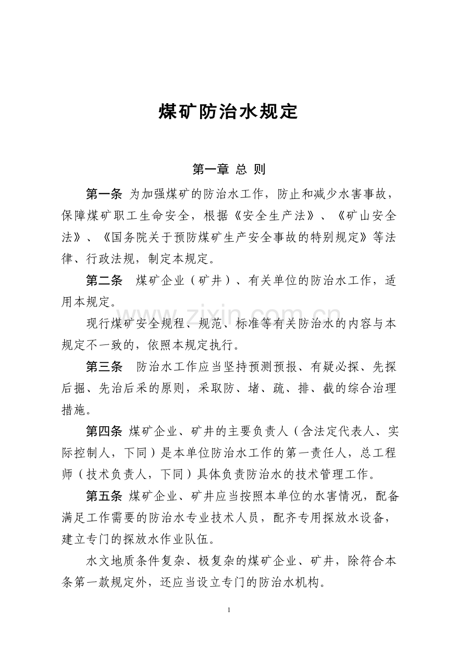 第一条 为加强煤矿的防治水工作,防止和减少水害事故,保障煤矿职工生命安全,根据《安全生产法》、《矿山安全法》、《国务院关于预防煤矿生产安全事故的特别规定》等法律、行政法规,制定本规定。