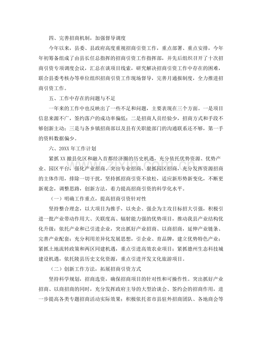 20XX年,XX在市委、市政府的领导下,紧紧围绕三年倍增、实现跨越发展的总体目标,紧扣招商引资主题,坚持把招商引资和推进项目建设作为核心要务,狠抓责任落实,进一步改善和优化投资环境,强力推进招商引资和项目建设工作,全县招商引资工作保持了良好的发展态势,招商引资工作取得显著成效。