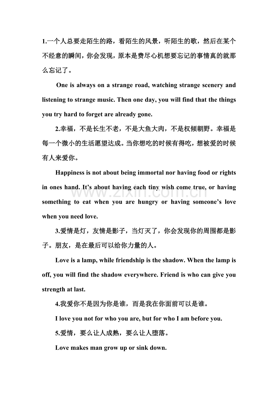 1.一个人总要走陌生的路,看陌生的风景,听陌生的歌,然后在某个不经意的瞬间,你会发现,原本是费尽心机想要忘记的事情真的就那么忘记了。