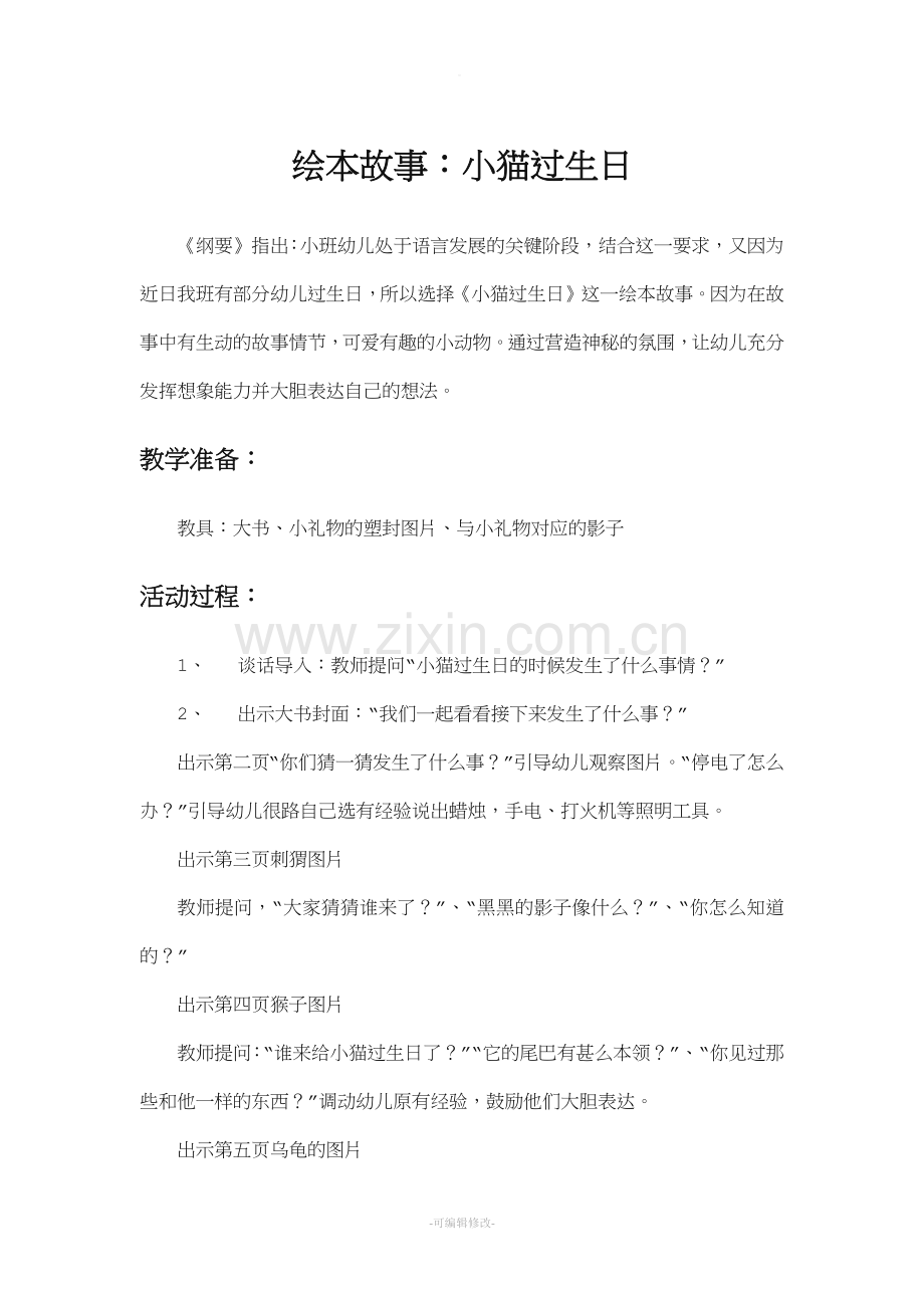 1、 谈话导入:教师提问“小猫过生日的时候发生了什么事情?”